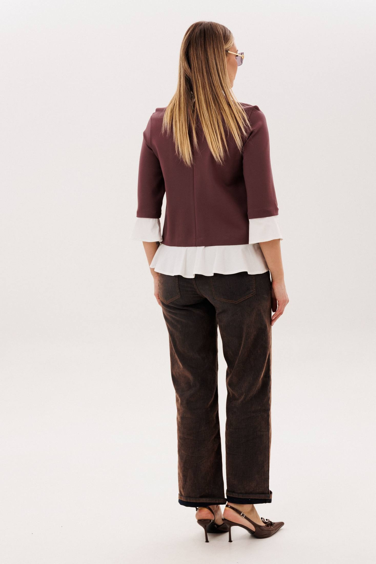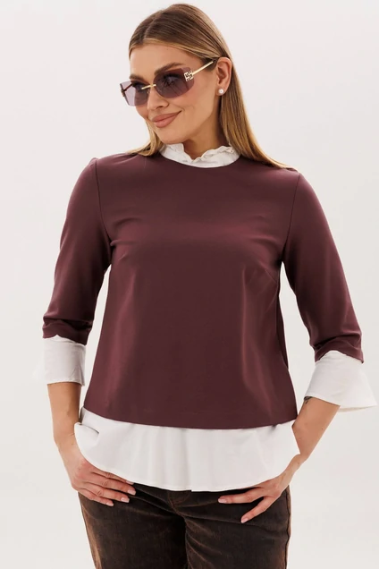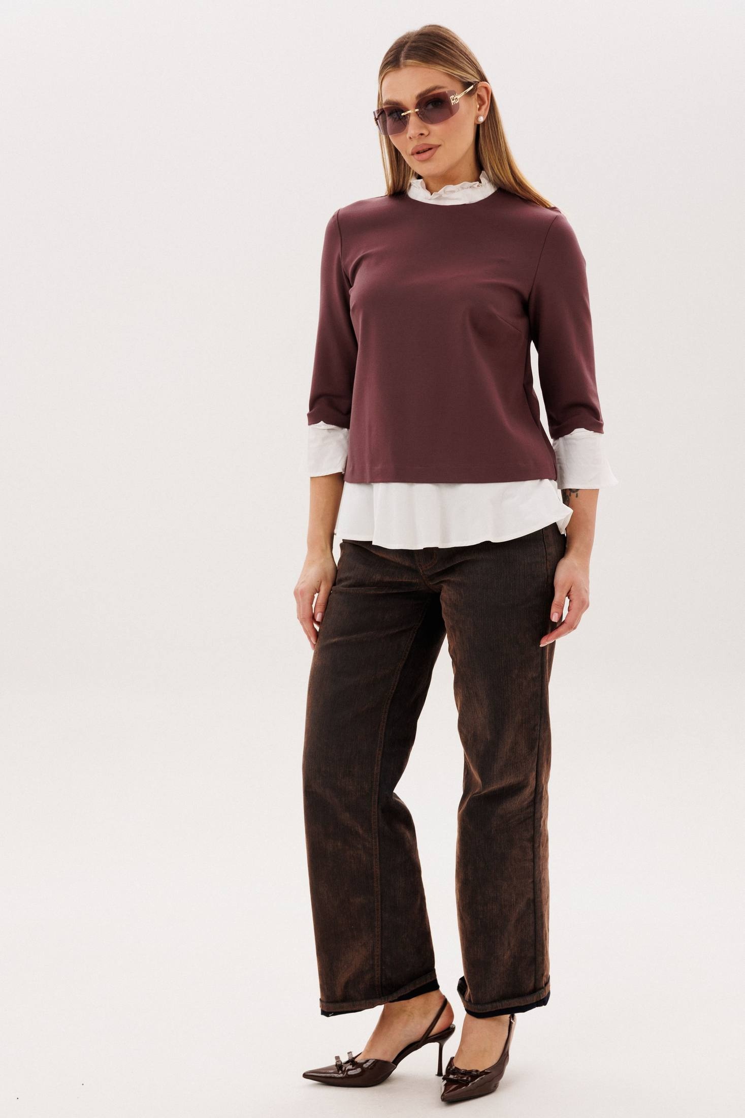 Джемпер 1824 махагон Anelli от коллекции бренда Анелли воплощает стиль и комфорт в одном изделии. Выполнен из мягкого и приятного на ощупь полиэстера с добавлением вискозы, что делает блузу долговечной и сохраняющей форму. Акцентные съёмные белые манжеты и воротник придают дополнительную выразительность и позволяют менять стиль по вашему настроению. Полуприлегающий силуэт и рукава 3/4 подходят для любого сезона, будь то весна или осень. Эффективная игра с контрастом цветов — комбинация махагонового и белого — добавляет авторский штрих, делая модель подходящей как для повседневного, так и для офисного гардероба.