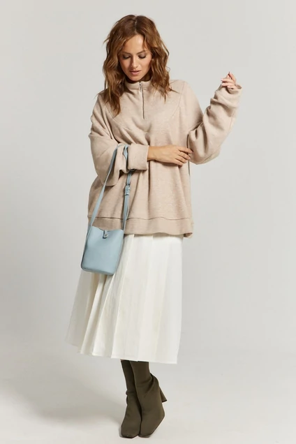 Бежевый джемпер выполнен из мягкого плотного трикотажа, что обеспечивает тепло и комфорт. Горловина стойка с молнией. Рукав спущенный.