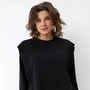 Свитшот свободного силуэта, с V-образным вырезом, обработанным обтачкой, пройма рукава спущена, низ рукава и низ изделия обработаны манжетой из основного материала. Модель выполнена из тактильно приятного трикотажа с содержанием вискозы.