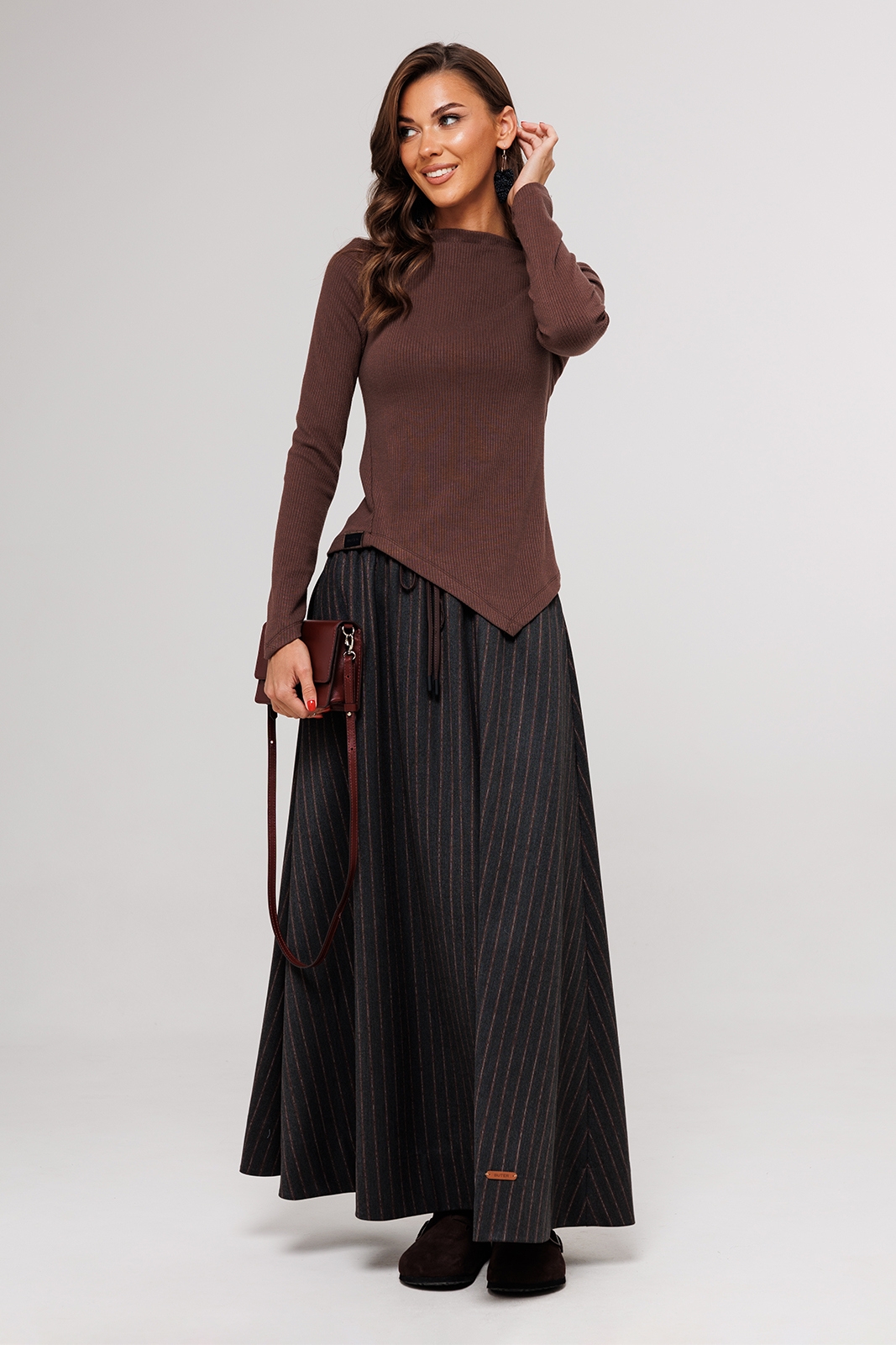 Джемпер трикотажный полуприлегающего силуэта с втачным одношовным рукавом, низ рукава фигурный. Полочка с фигурным низом и правый боковой шов к низу слегка переходит на перед. По переду нашивка "BUTER". Горловина, расширенная с невысокой цельнокроеной стойкой. Брошь не идет в комплект к джемперу.