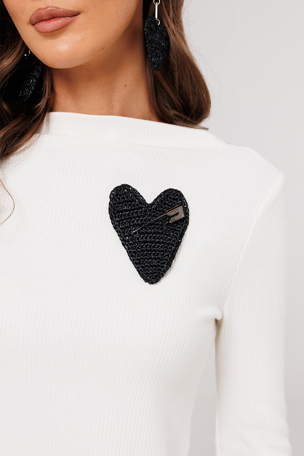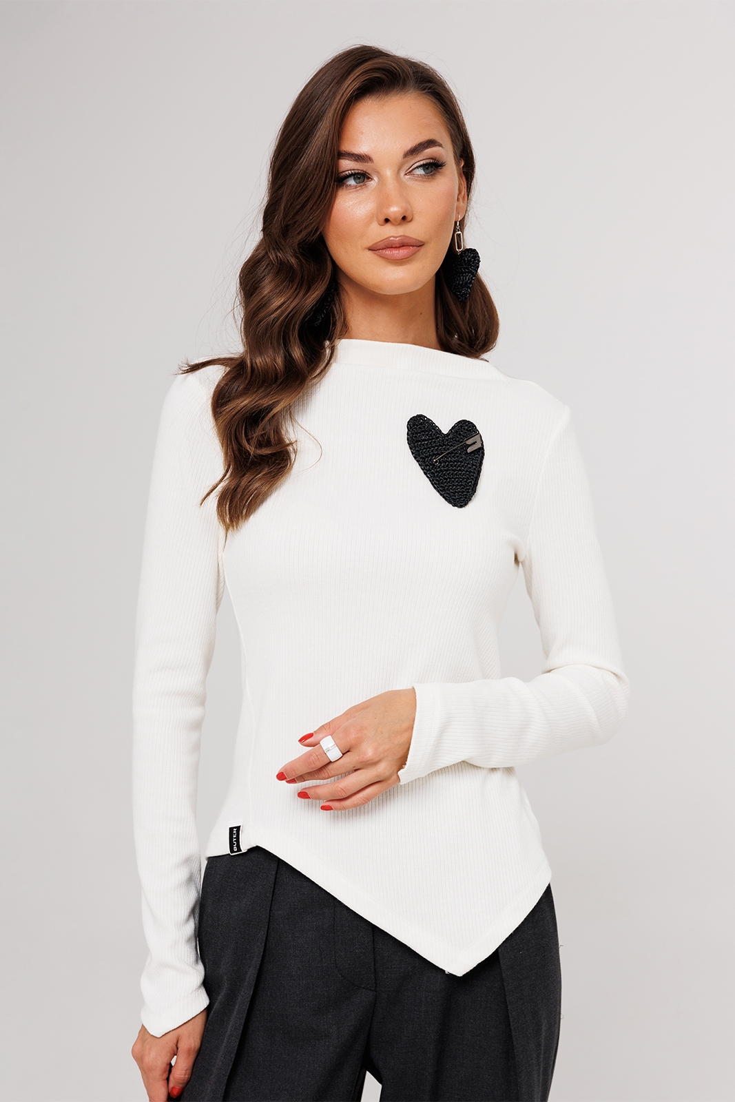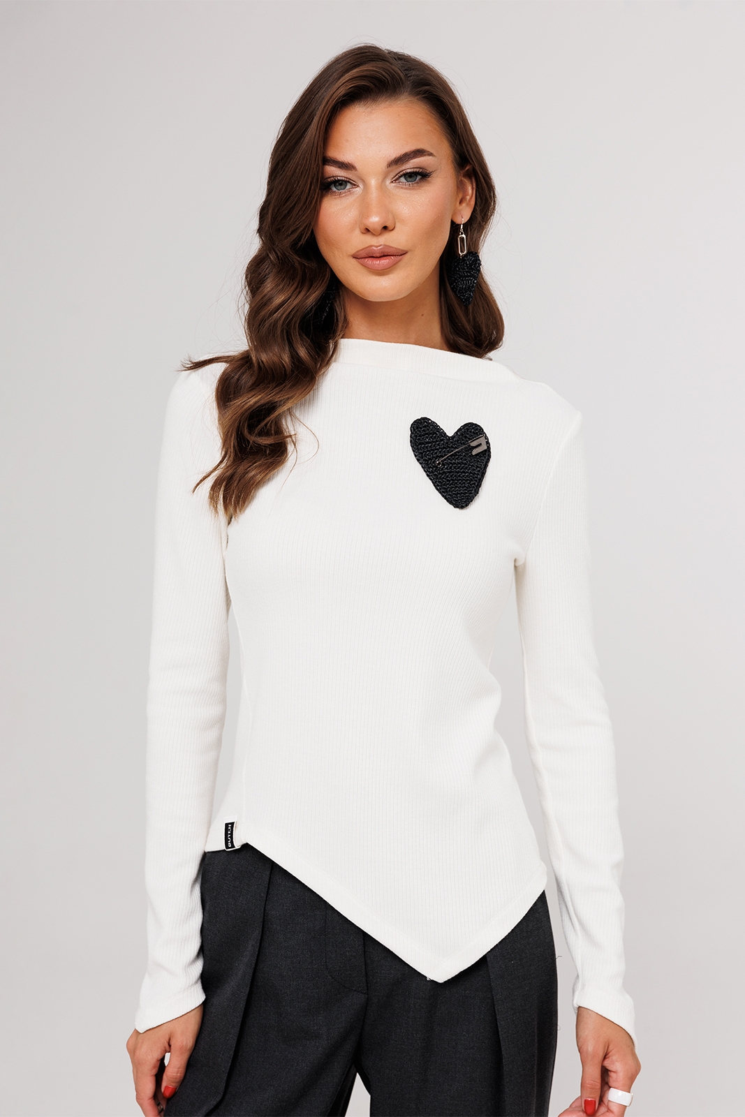 Джемпер трикотажный полуприлегающего силуэта с втачным одношовным рукавом, низ рукава фигурный. Полочка с фигурным низом и правый боковой шов к низу слегка переходит на перед. По переду нашивка "BUTER". Горловина, расширенная с невысокой цельнокроеной стойкой. Брошь не идет в комплект к джемперу.