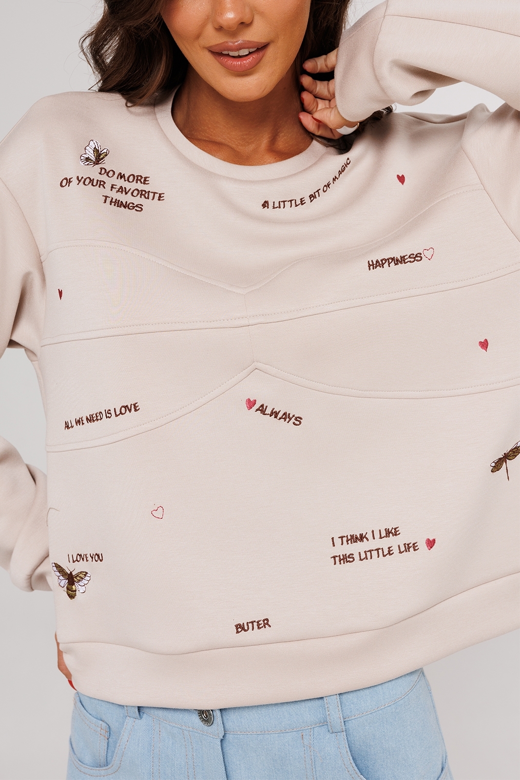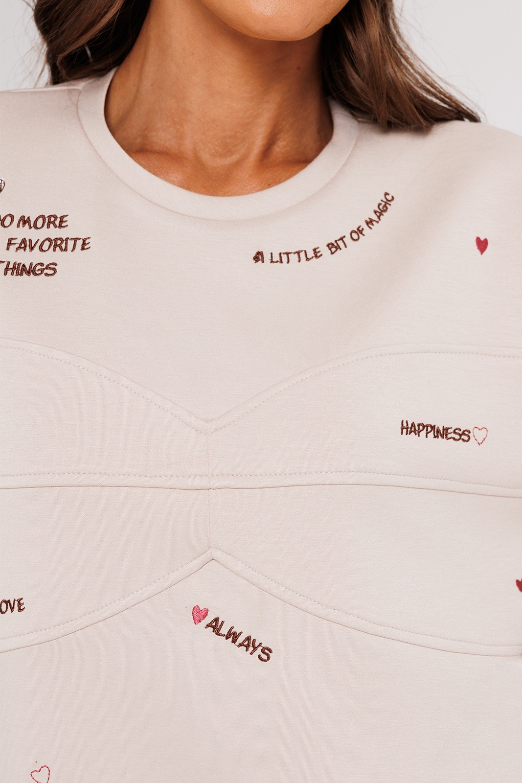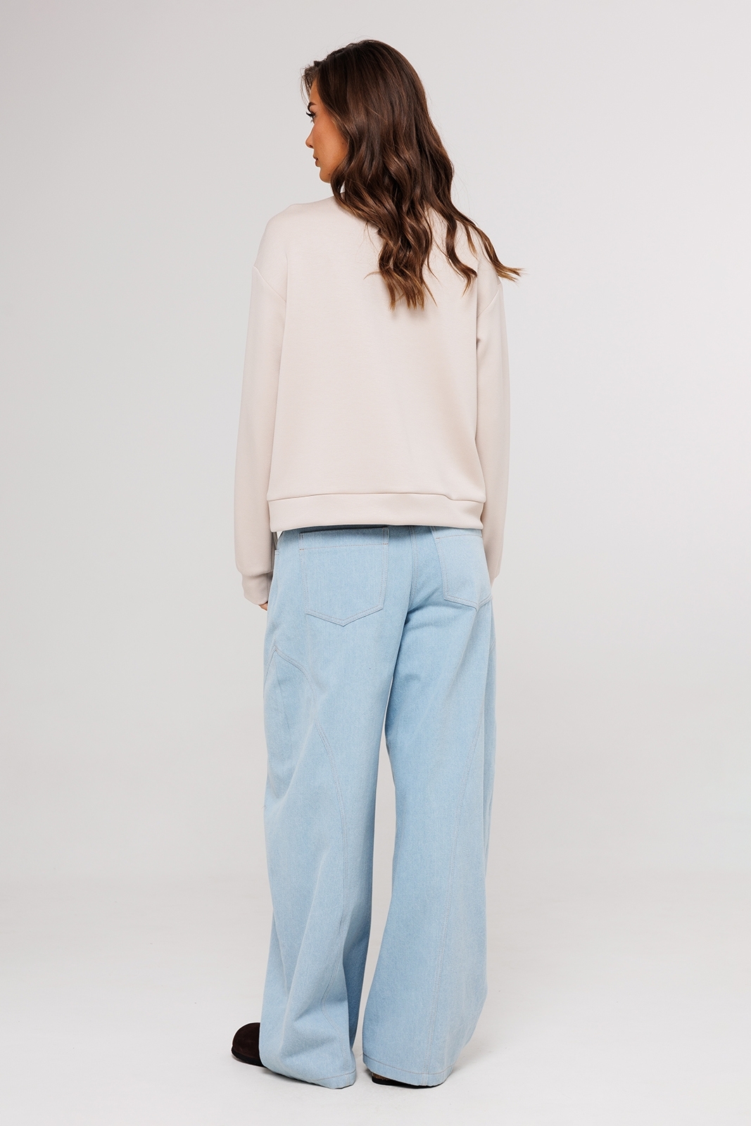Джемпер из технологичного трикотажного полотна с эффектом peach. Прямого силуэта с втачным рукавом и спущенной линией плеча, с манжетой из основной ткани по низу рукава. Полочка с фигурными подрезами, имитирующими лиф и вышивкой. По горловине и низу изделия притачная планка из основной ткани.