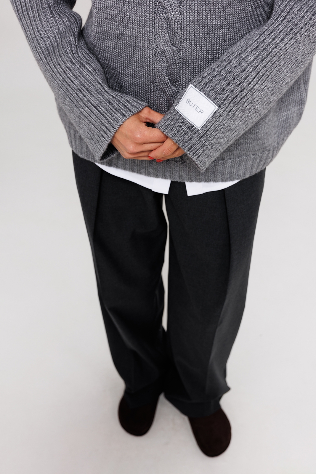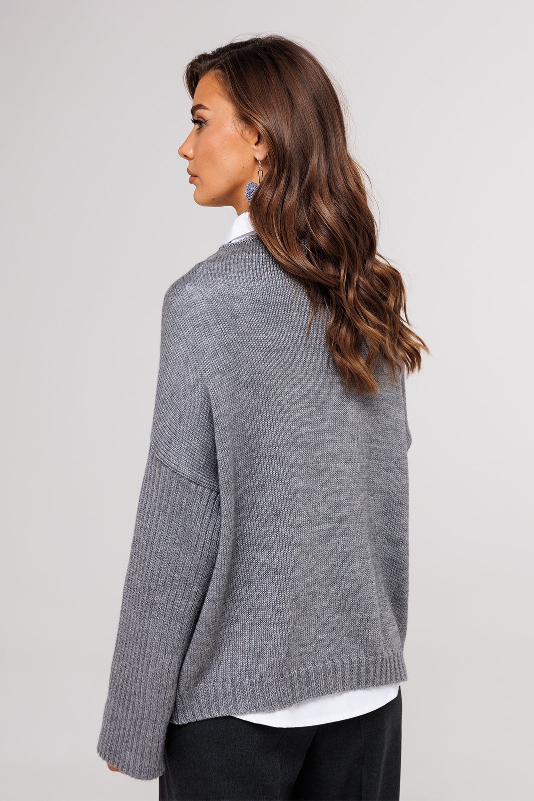 Джемпер трикотажный вязанный с длинным втачным рукавом и спущенной линией плеча. Внизу на левом рукаве нашивка "BUTER". По перед вывязан узор "Коса". Горловина, расширенная с невысокой цельнокроеной стойкой.