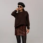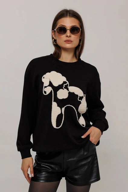 Джемпер из технологичного трикотажного полотна с эффектом peach. Прямого силуэта с втачным рукавом и спущенной линией плеча, с манжетой из отделочной ткани по низу рукава. По переду вышивка "Лошадка". По горловине и низу изделия притачная планка из отделочной ткани.