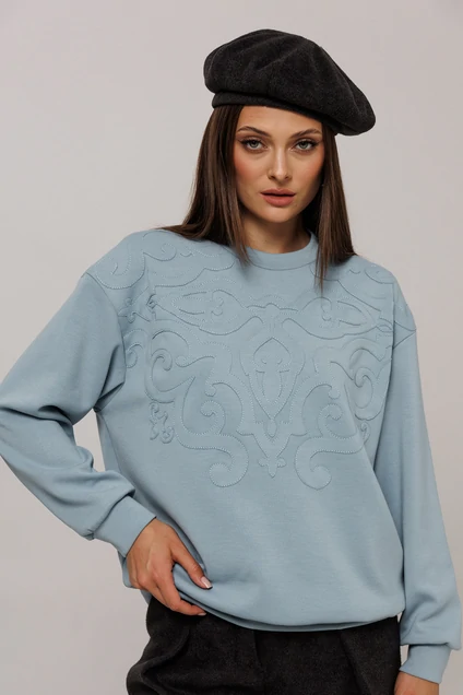 Джемпер из технологичного трикотажного полотна с эффектом peach. Прямого силуэта с втачным рукавом и спущенной линией плеча, с манжетой из основной ткани по низу рукава. По переду вышивка "Орнамент". По горловине и низу изделия притачная планка из основной ткани.