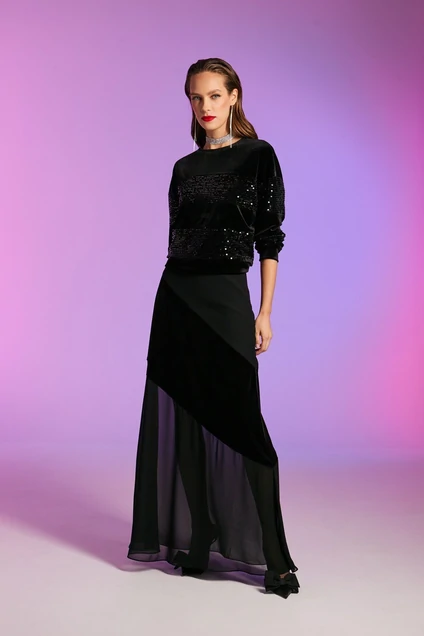 Джемпер, комбинированный из трикотажного полотна велюр и велюр с пайетками, свободного кроя, со спущенной линией плеча, длиной выше линии бёдер, с рукавами длиной до запястья с притачными манжетами. Горловина округлой формы с притачной планкой. Детали переда, спинки и рукавов с горизонтальными сечениями. Низ джемпера слегка присобран притачной планкой. Джемпер на тонкой трикотажной подкладке.