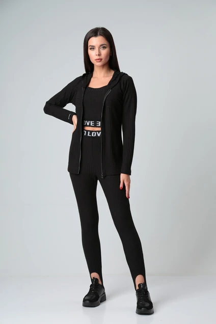 Кофта женская из трикотажного полотна с центральной бортовой застёжкой на молнию. Перед с отрезными бочками внизу с кокеткой переходящей в рукав. Спинка тоже с кокеткой, переходящей в рукав. Воротник-капюшон с кулисой и шнуром. На правом рукаве по низу декоративная нашивка.