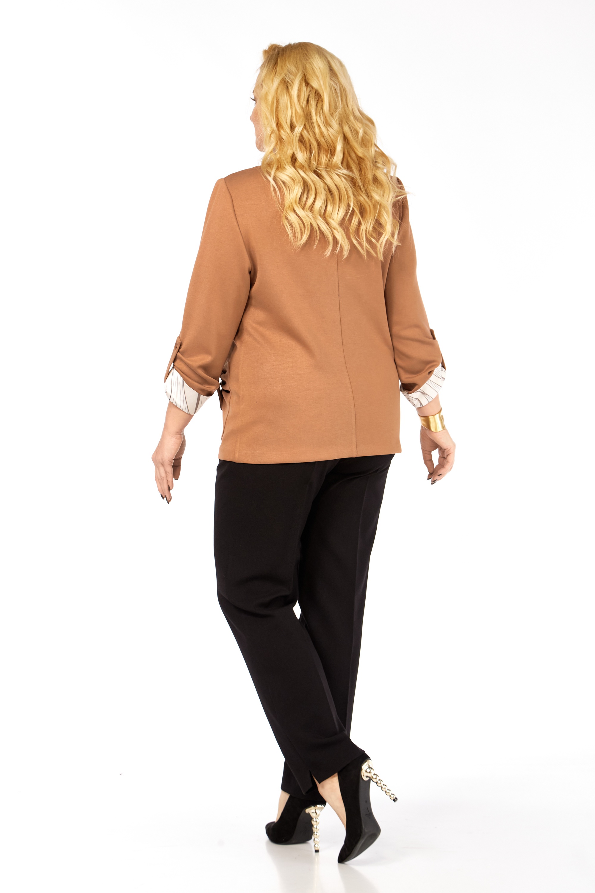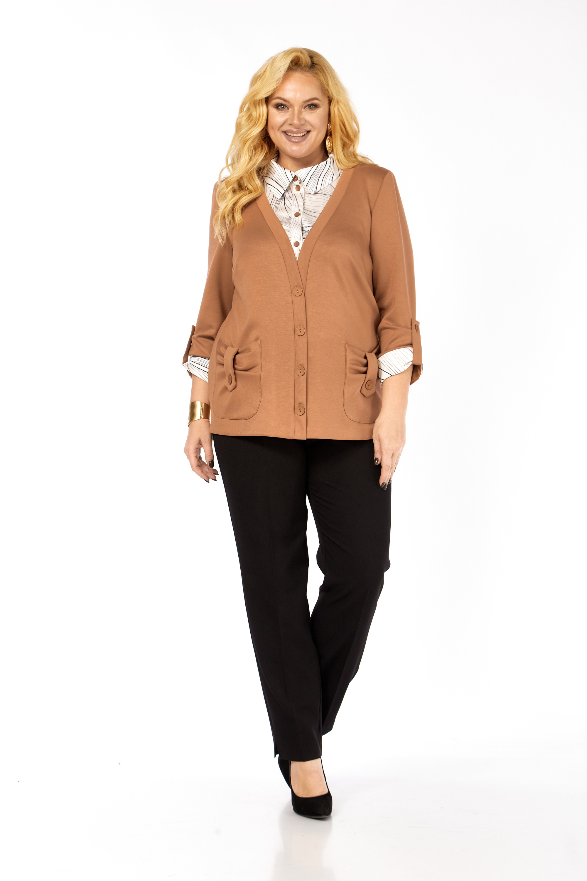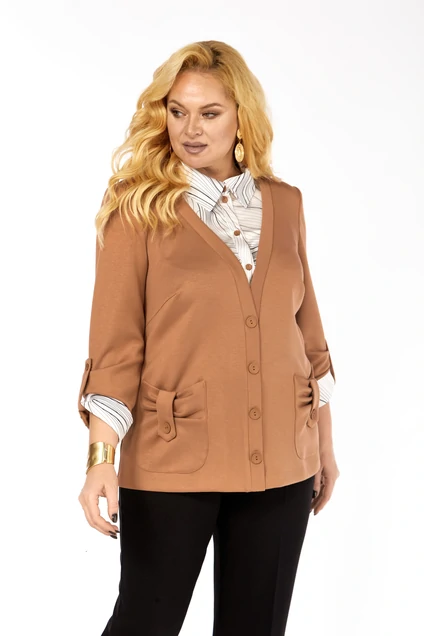 Имитация рубашки под джемпером - это отличный вариант практичной и удобной одежды. Джемпер прямого силуэта, комбинированный, выполнен из мягкого трикотажа и блузочной ткани. Полочка с нагрудными вытачками, накладными фигурными карманами, декорированной патой. Стояче-отложной воротник блузки хорошо смотрится с V-образным вырезом горловины. Рукав втачной, одношовный, с отложной манжетой из отделочной ткани. Пата на рукаве позволяет регулировать его длину.
