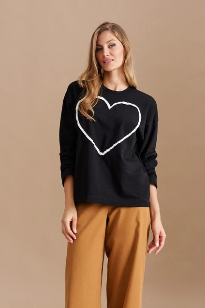 Джемпер женский свободного кроя из трикотажного хлопкового полотна. Изделие с длинным втачным рукавом. По переду декоративные элементы в виде дизайнерской аппликации. Длина изделия до линии бедер.