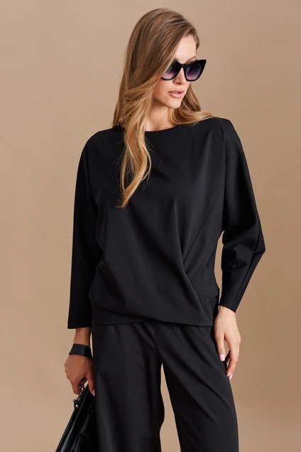 Джемпер женский свободного кроя из трикотажного полотна.Рукав цельнокроеный длинный. По переду декоративный элемент в виде драпировки. По спинке рельефный шов и вытачка. Длина изделия до линии бедер.