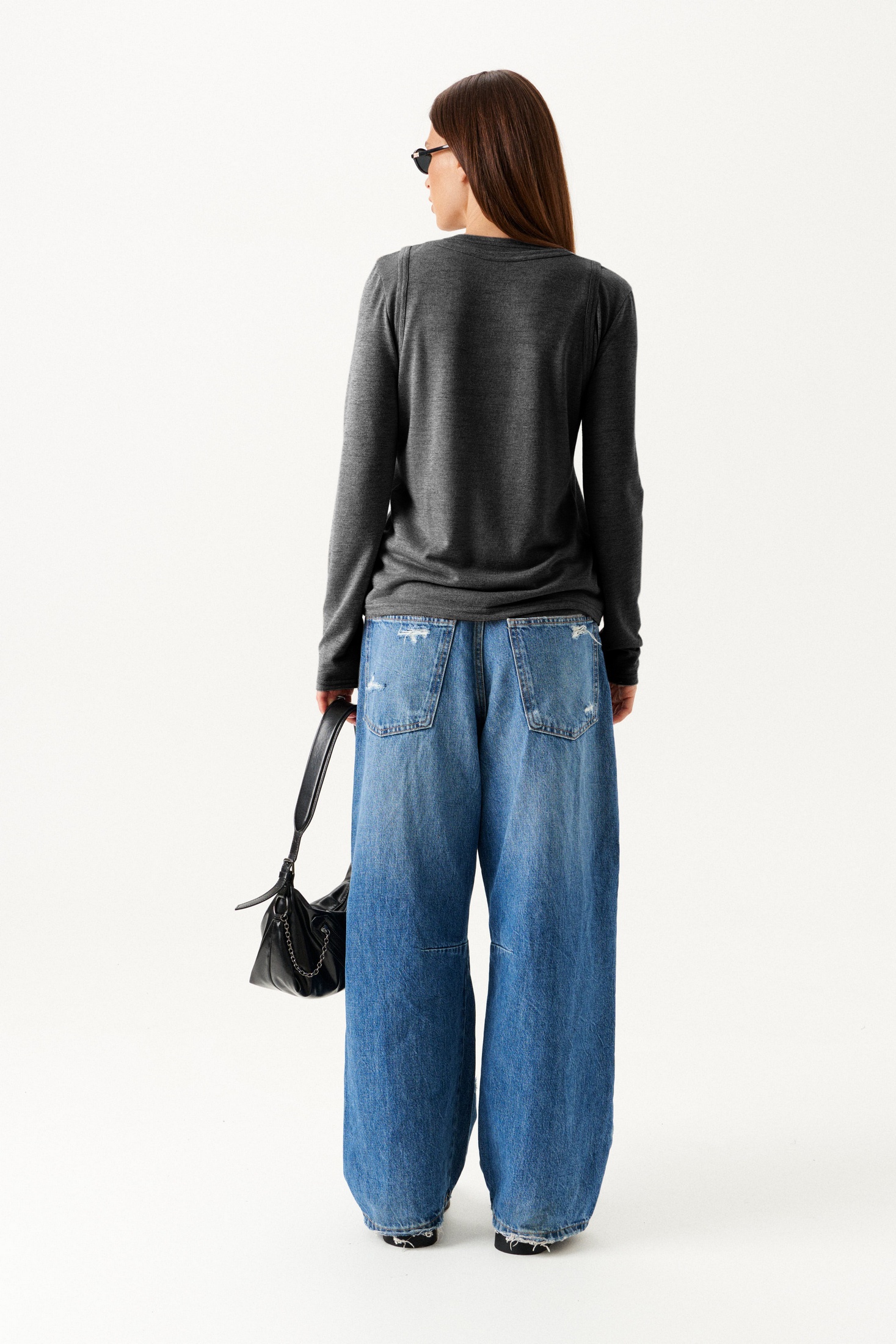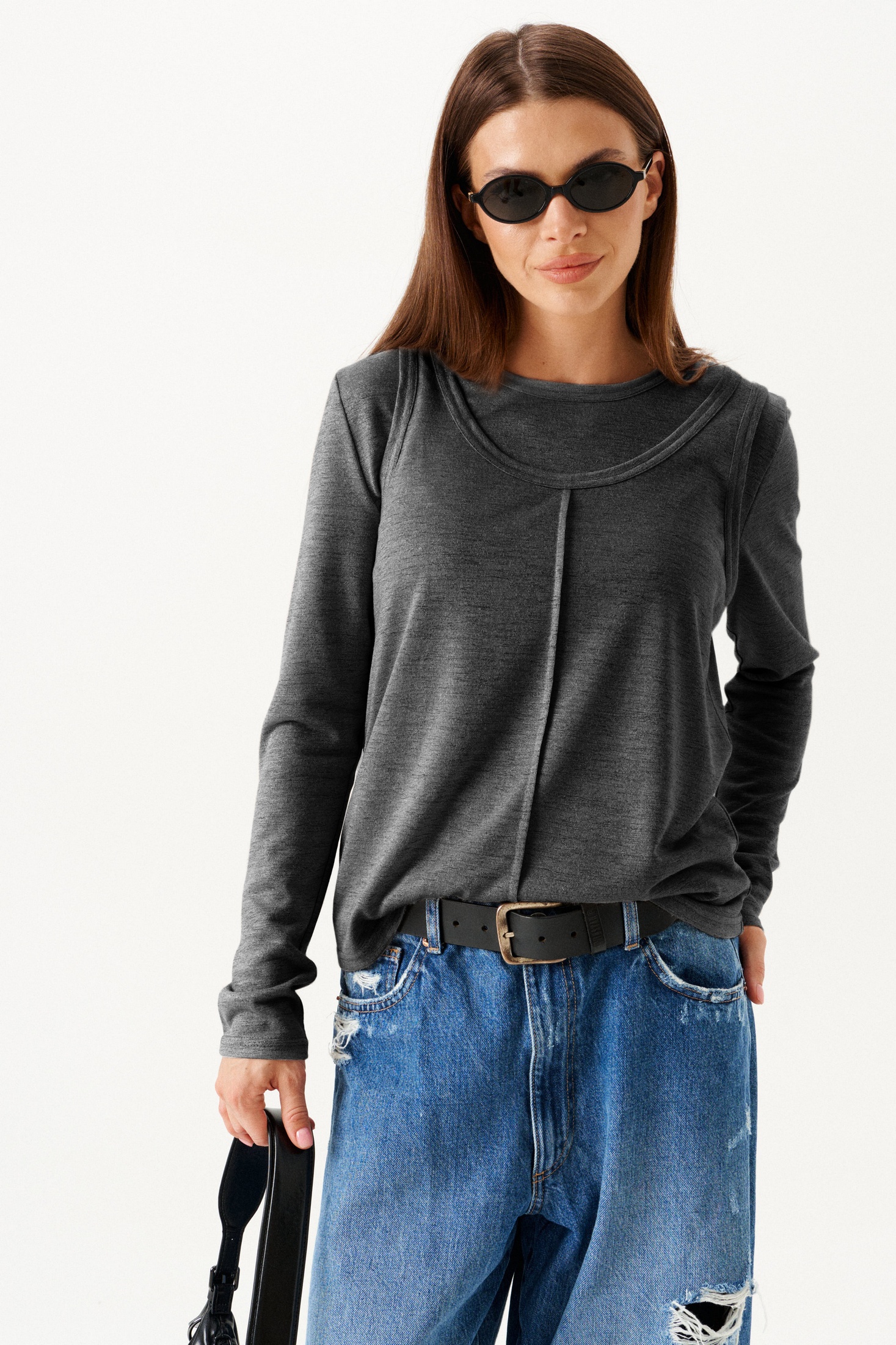 Комплект женской одежды, состоящий из блузы и джемпера. Блуза выполнена в полуприлегающем силуэте с круглым вырезом горловины, украшена центральным защипом спереди. Спина блузы цельная, без швов. Джемпер тоже полуприлегающего кроя, дополнен втачными длинными рукавами, поддерживая общую лаконичность силуэта. Оба элемента комплекта выполнены из мягкого трикотажного полотна в универсальном темно-сером цвете, что делает их идеальными для многочисленных комбинирований в гардеробе. Этот набор идеально подходит для создания стильного и утонченного образа.