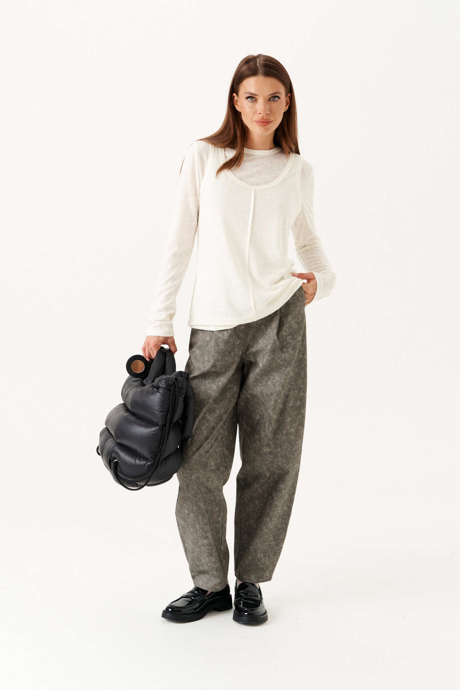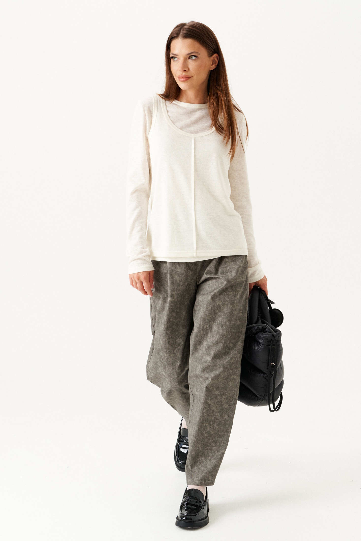 Элегантный и универсальный женский комплект из двух предметов в пастельно-бежевом оттенке. Блуза выполнена из мягкого трикотажного полотна, имеет полуприлегающий силуэт и круглый вырез горловины. Особенностью дизайна блузы служит центральный защип от горловины до нижнего края, придающий изделию изящный вид. Джемпер также изготовлен из трикотажа, характеризуется умеренным объемом и полуприлегающим кроем. Длинные втачные рукава добавляют комфорта и стиля, делая его идеальным выбором для прохладных дней. Этот нежный и стильный комплект станет прекрасным дополнением к гардеробу современной женщины.