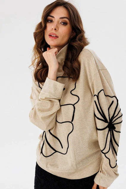 Джемпер выполнен из трикотажного полотна. Джемпер О-образного силуэта, длиной до линии бедер. Перед и спинка цельные. Горловина округлой формы с воротником-стойкой. Плечевой шов удлинен. Рукав рубашечного покроя, одношовный. Низ рукава на притачной манжете из основной ткани. Джемпер декорирован вышивкой по переду и левому рукаву.