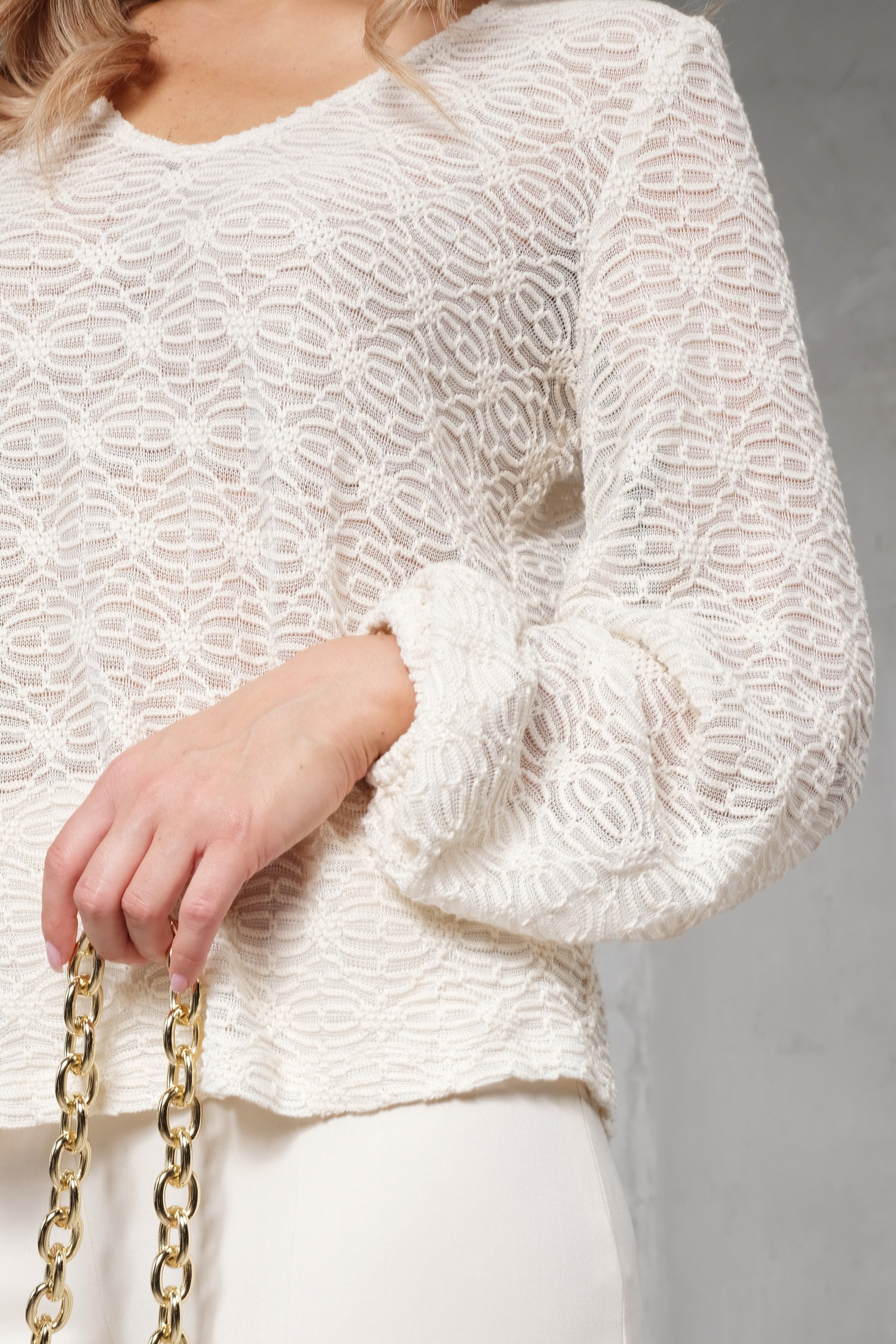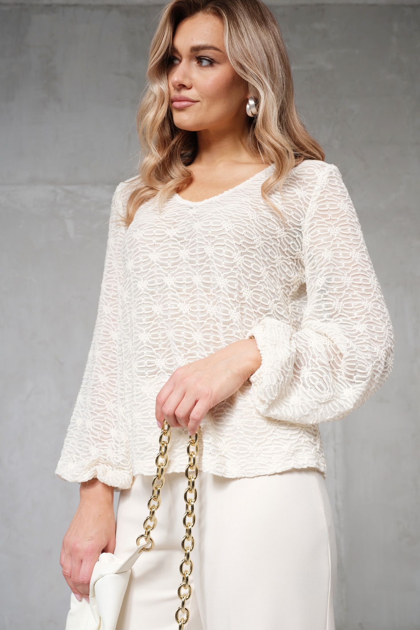 Элегантный кремовый джемпер прямого силуэта представляет собой исключительно стильный выбор для современных модниц. Эта модель с V-образным вырезом и длинными рукавами выполнена из высококачественного материала с тонким геометрическим узором в виде переплетенных линий, добавляющим текстурные акценты. Рукава на мягкой резинке подчеркивают игривый объем и позволяют регулировать их длину, что приносит элемент динамики в любой образ. Этот джемпер идеально подойдет как для офиса, так и для вечернего выхода, дополняя каждый наряд утонченной ноткой.