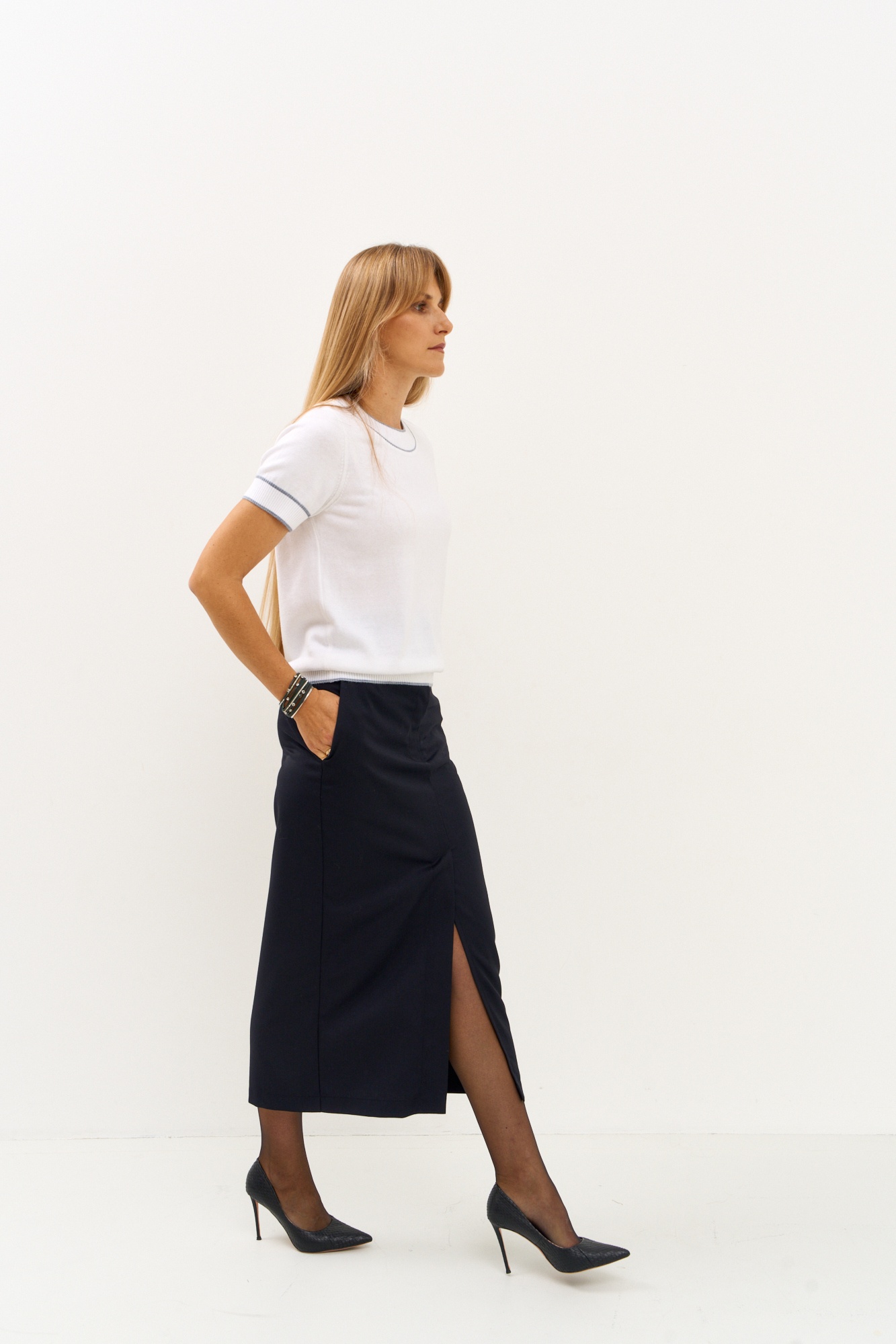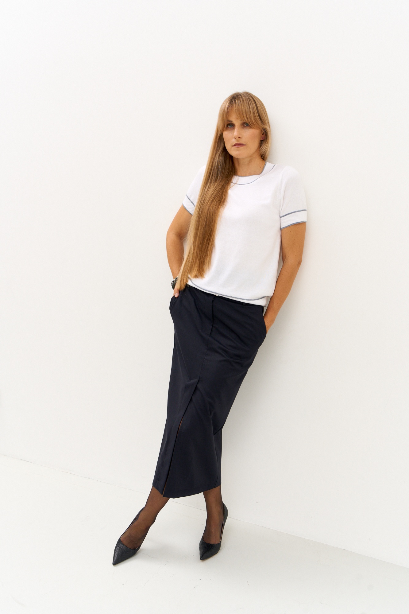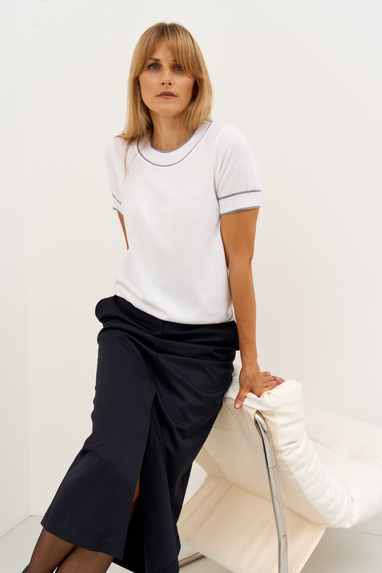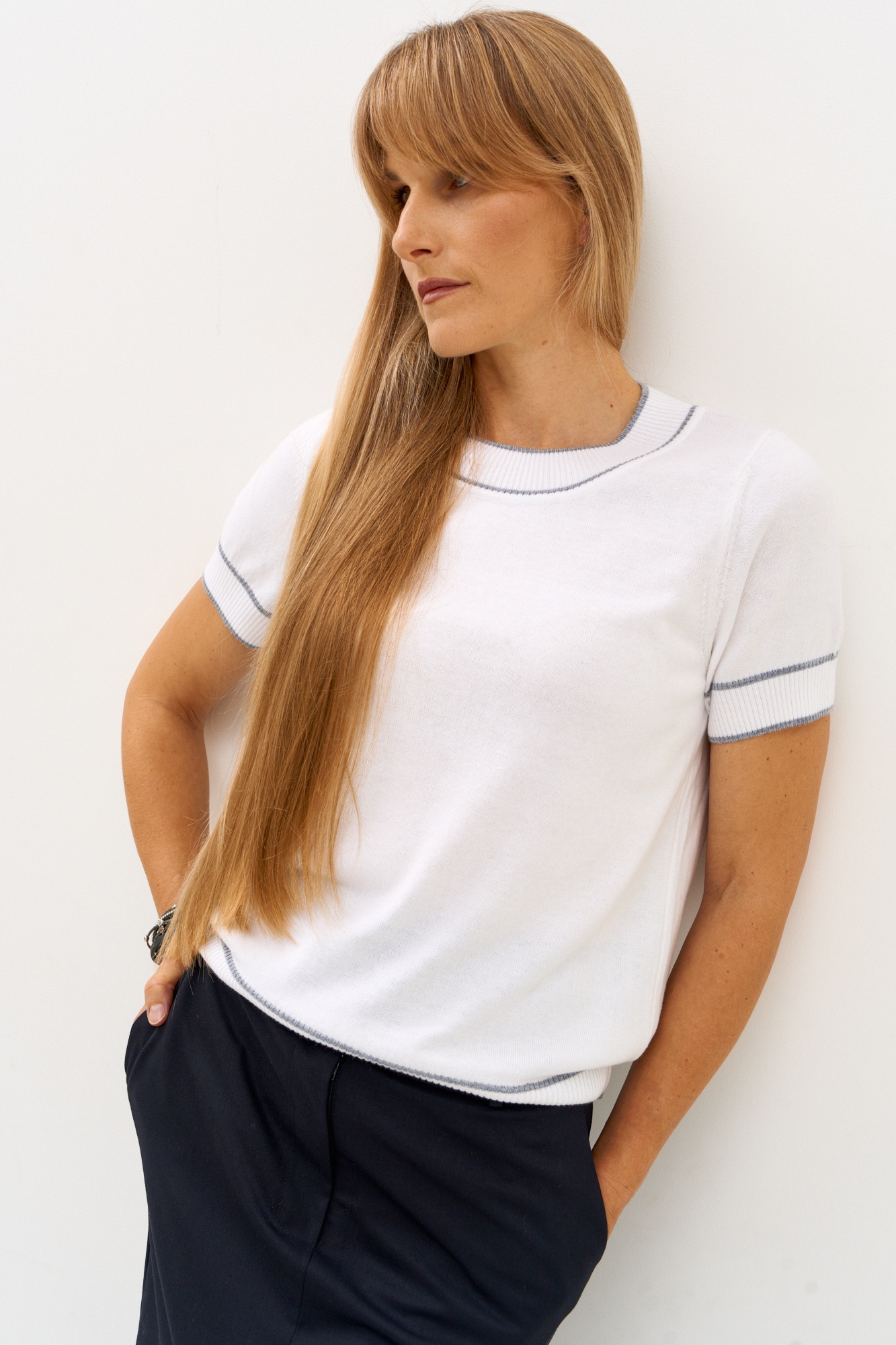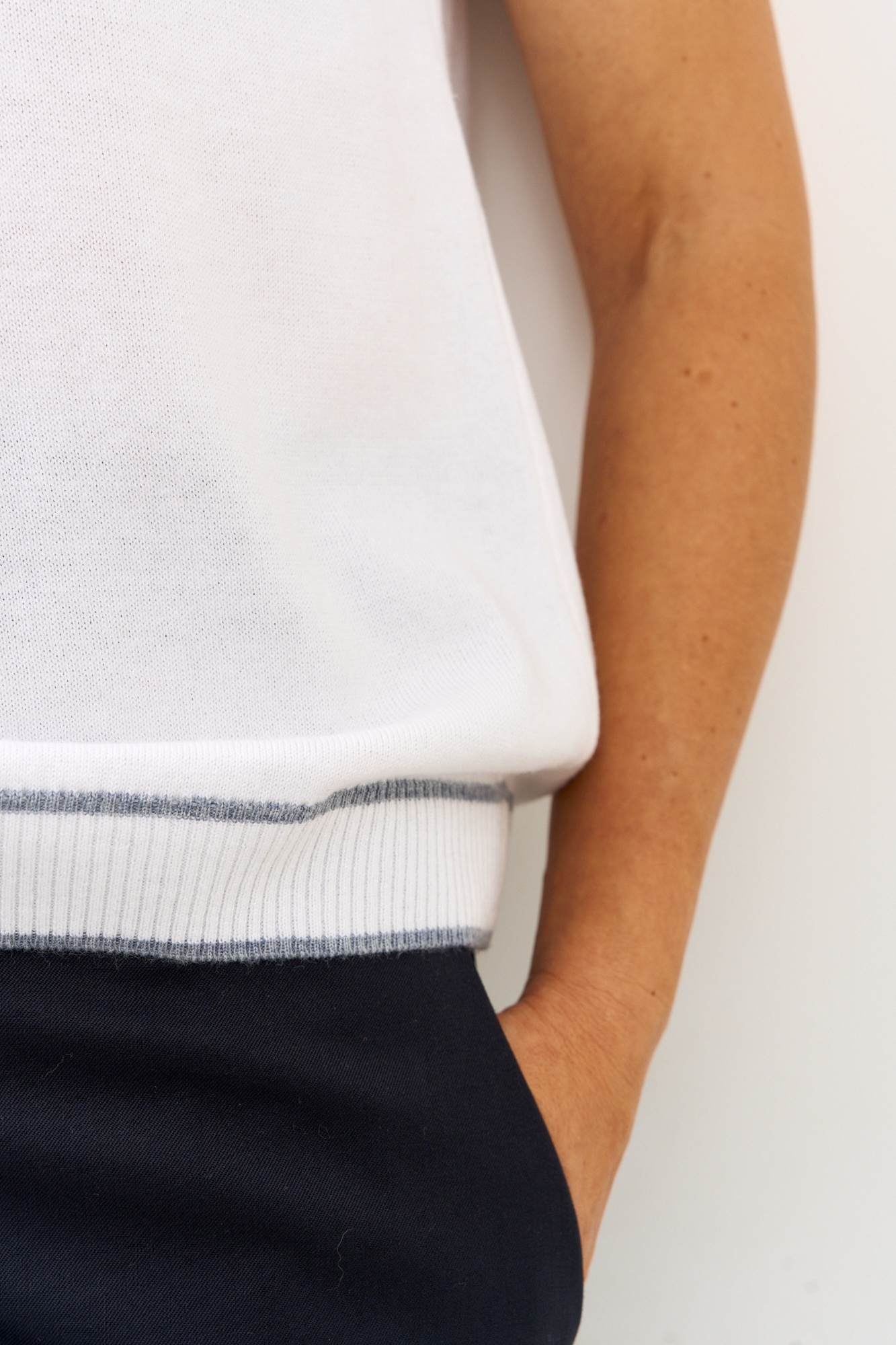 Джемпер женский, лонг-пуловер приталенного силуэта. Изготовлен из высококачественного немецкого хлопка, что обеспечивает одежде мягкость и долговечность. Основной цвет - светло-серый, с акцентами в виде тонких белых полос на окончаниях рукавов и воротнике. Дизайн минималистичный, но элегантний, делая его универсальным элементом для любого гардероба. Длина джемпера удлиненная, идеально подходит для сочетания с брюками или юбками высокой посадки.