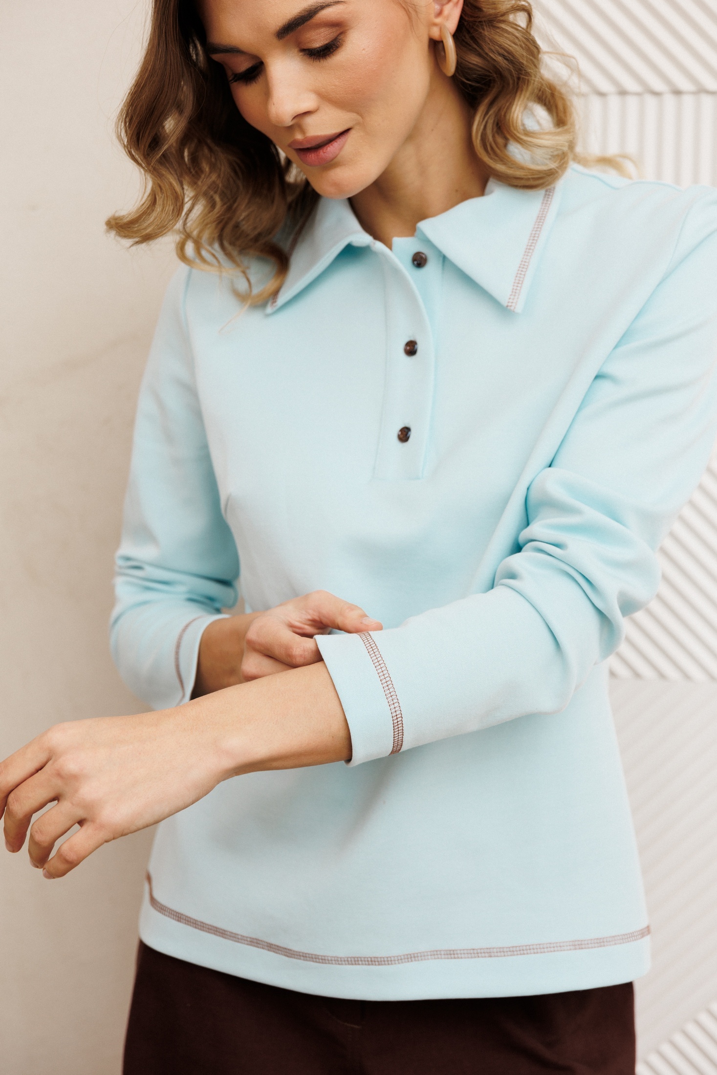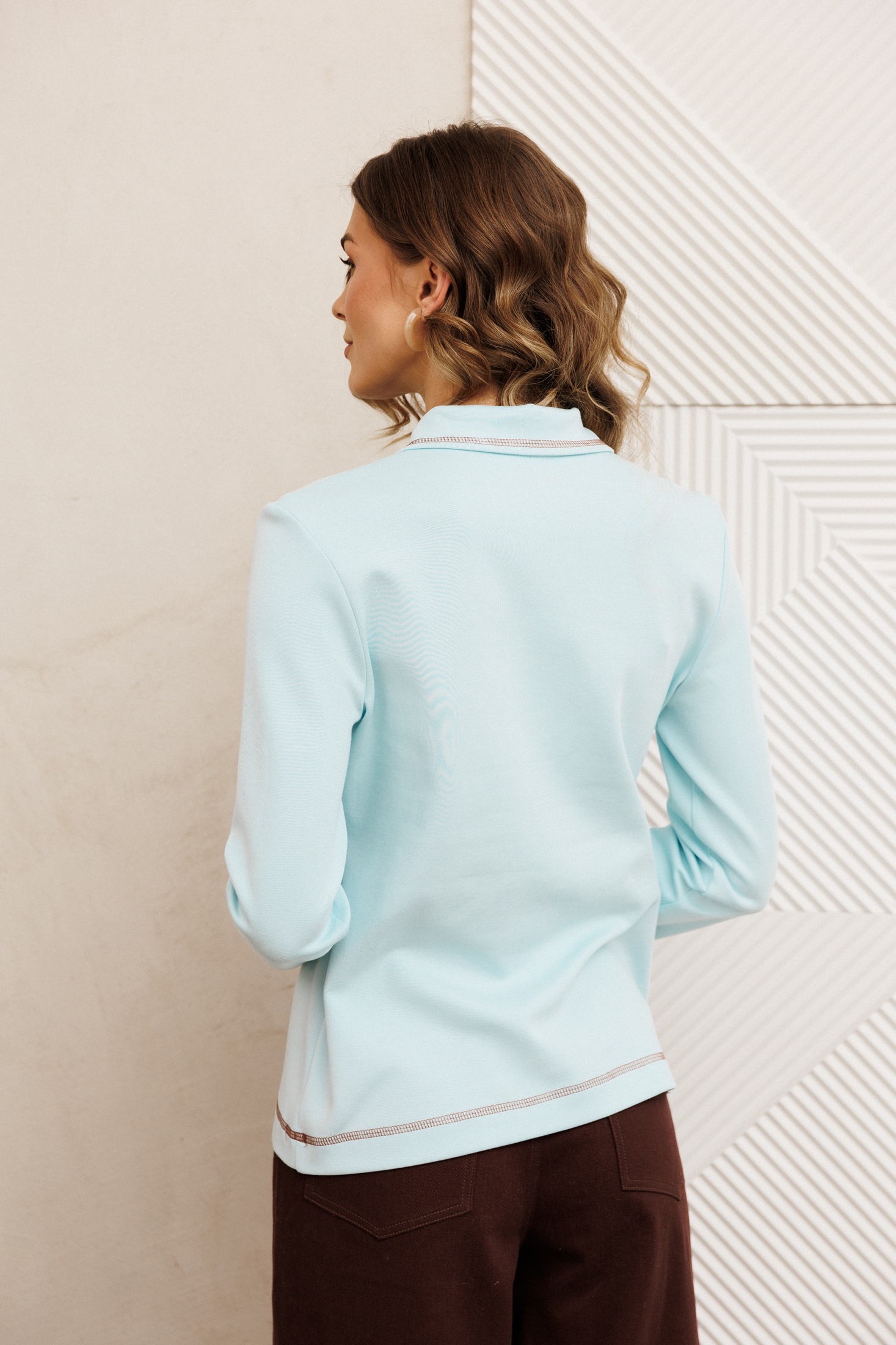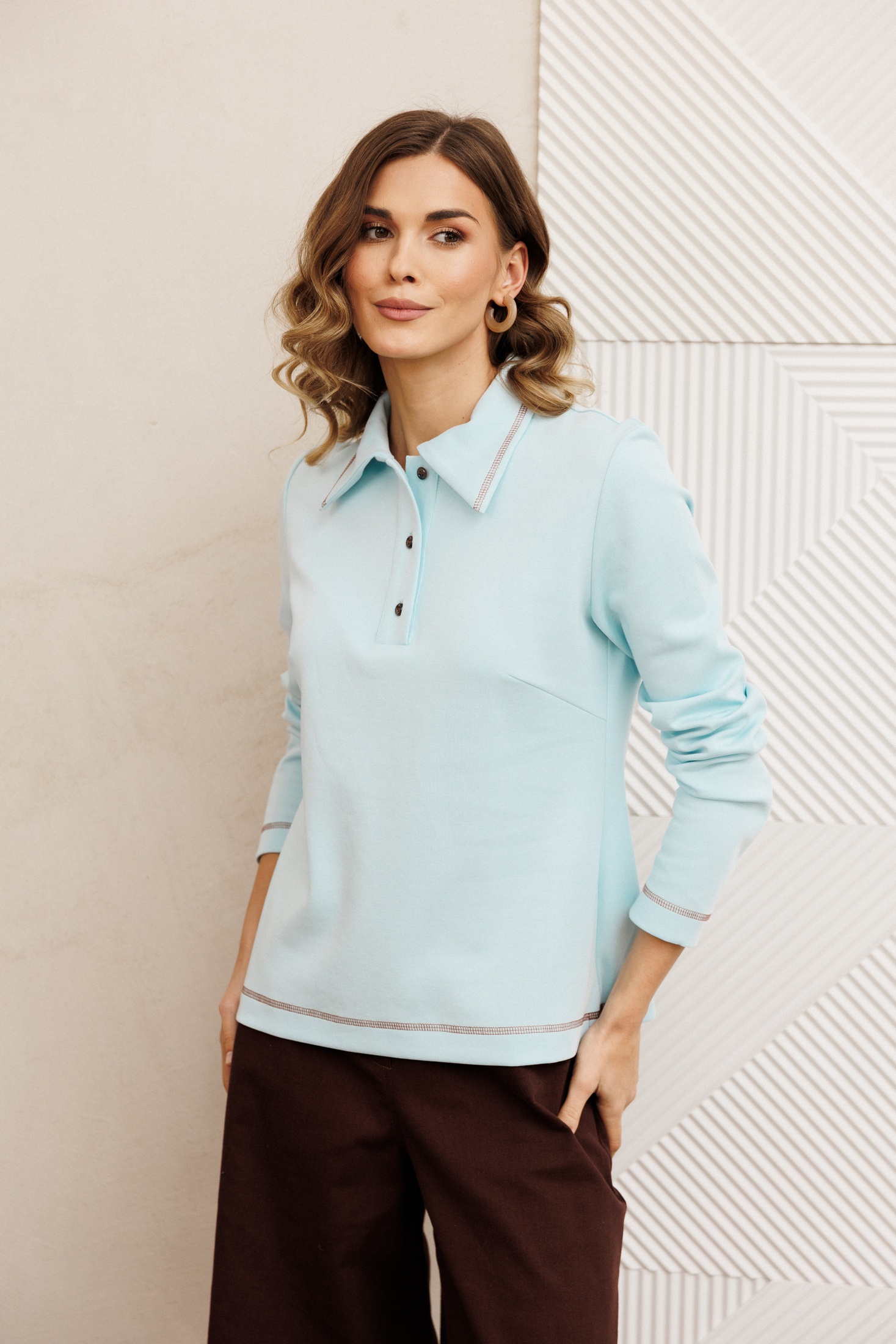 Джемпер прямого силуэта из трикотажного полотна. Перед с застежкой поло и нагрудными вытачками. По воротнику, низу изделия и низу рукава отстрочена декоративная строчка. Длина джемпера - 61 см, длина рукава - 61 см.