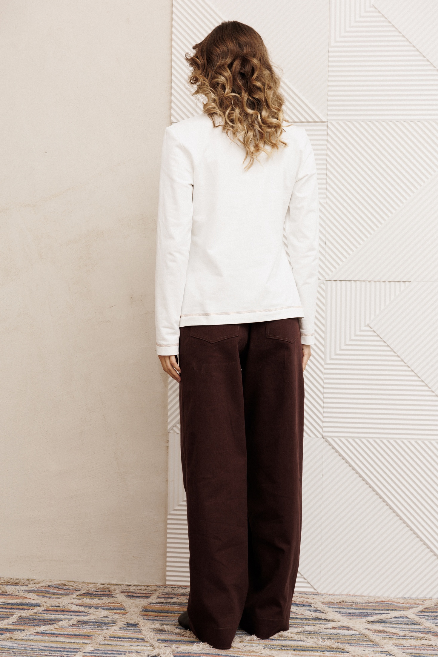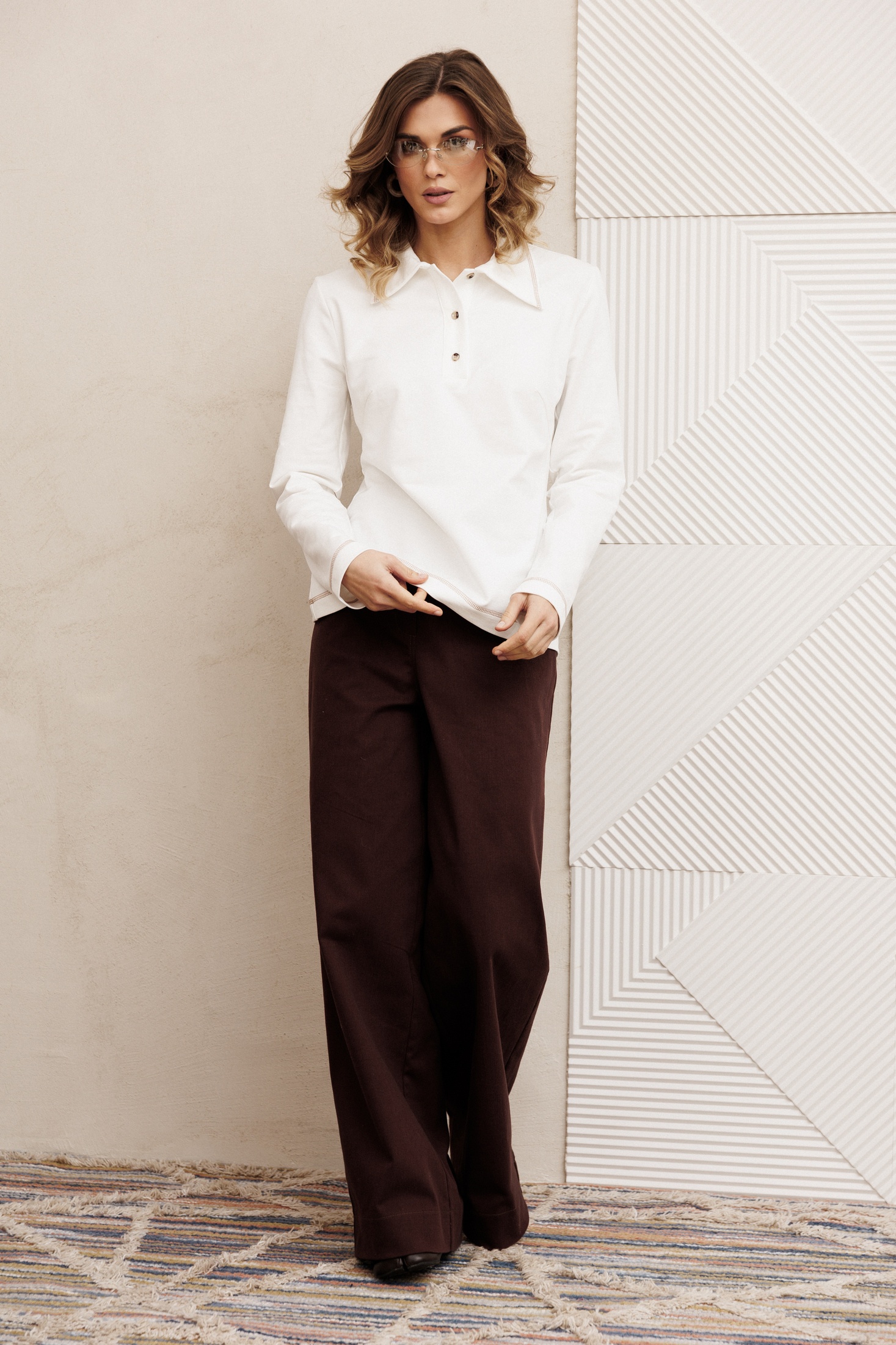 Джемпер прямого силуэта из трикотажного полотна. Перед с застежкой поло и нагрудными вытачками. По воротнику, низу изделия и низу рукава отстрочена декоративная строчка. Длина джемпера - 61 см, длина рукава - 61 см.