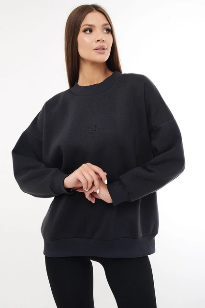 Женский современный свитшот оверсайз из комфортной ткани (футера 3-нитки с начёсом качества пенье). Свитшот имеет спущенную линию плеча и длинный рукав. Горловина, манжеты рукавов и низ свитшота из ткани-компаньена кашкорсе. Перед с вышивкой – логотипом по центру переда в цвет ткани.
