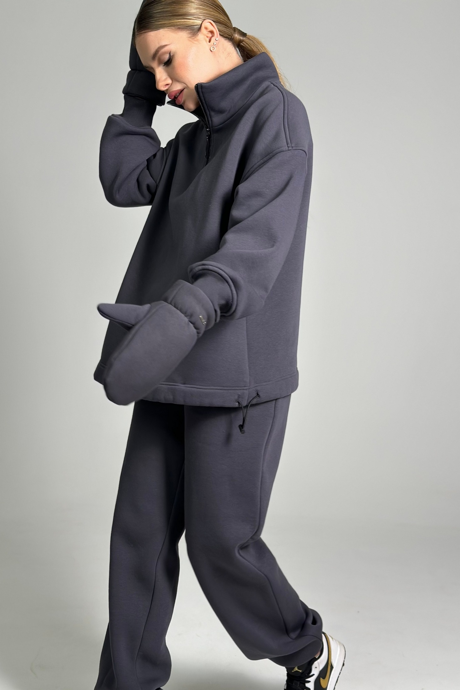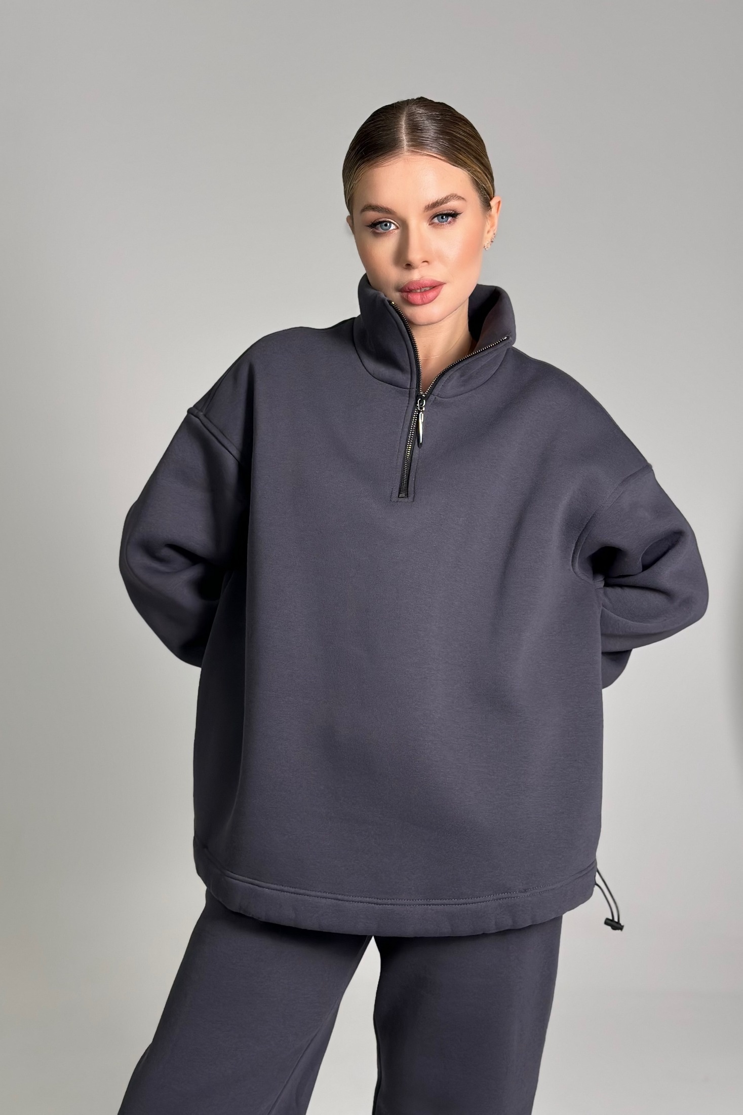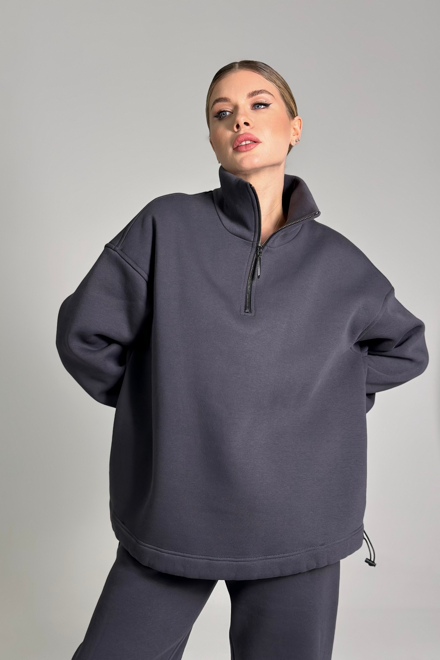 Ширина джемпера по низу регулируется с помощью резинки-жгута и двух фиксаторов, расположенных в подгибке низа.