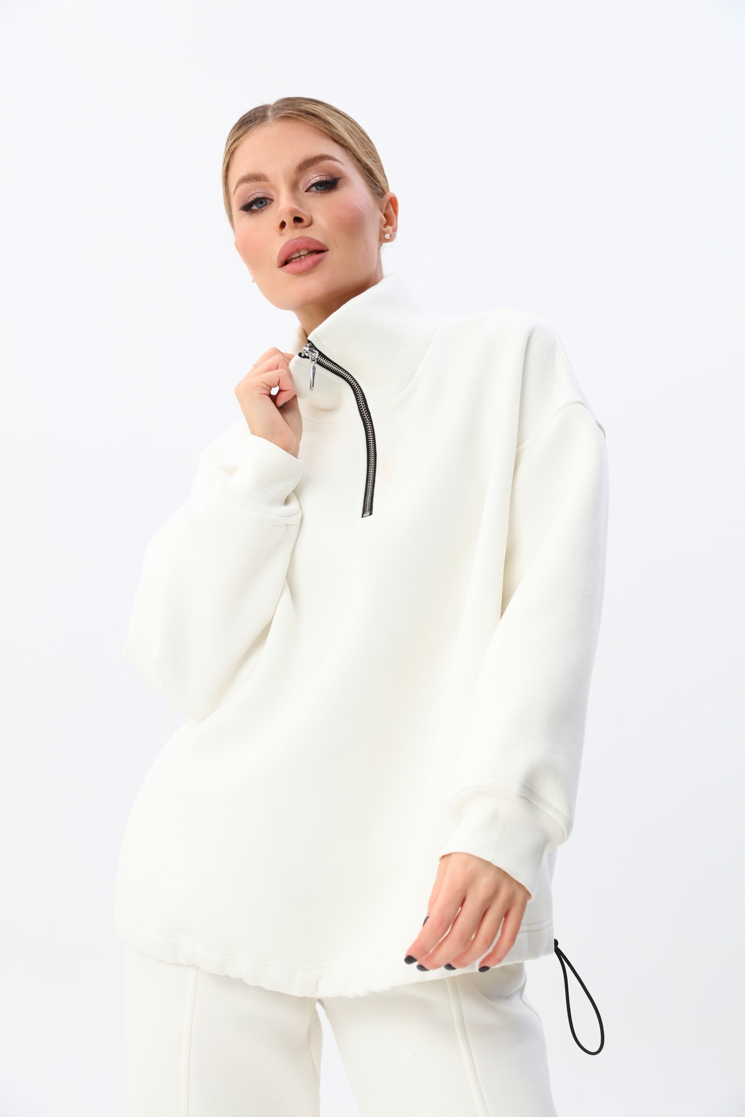 Ширина джемпера по низу регулируется с помощью резинки-жгута и двух фиксаторов, расположенных в подгибке низа.