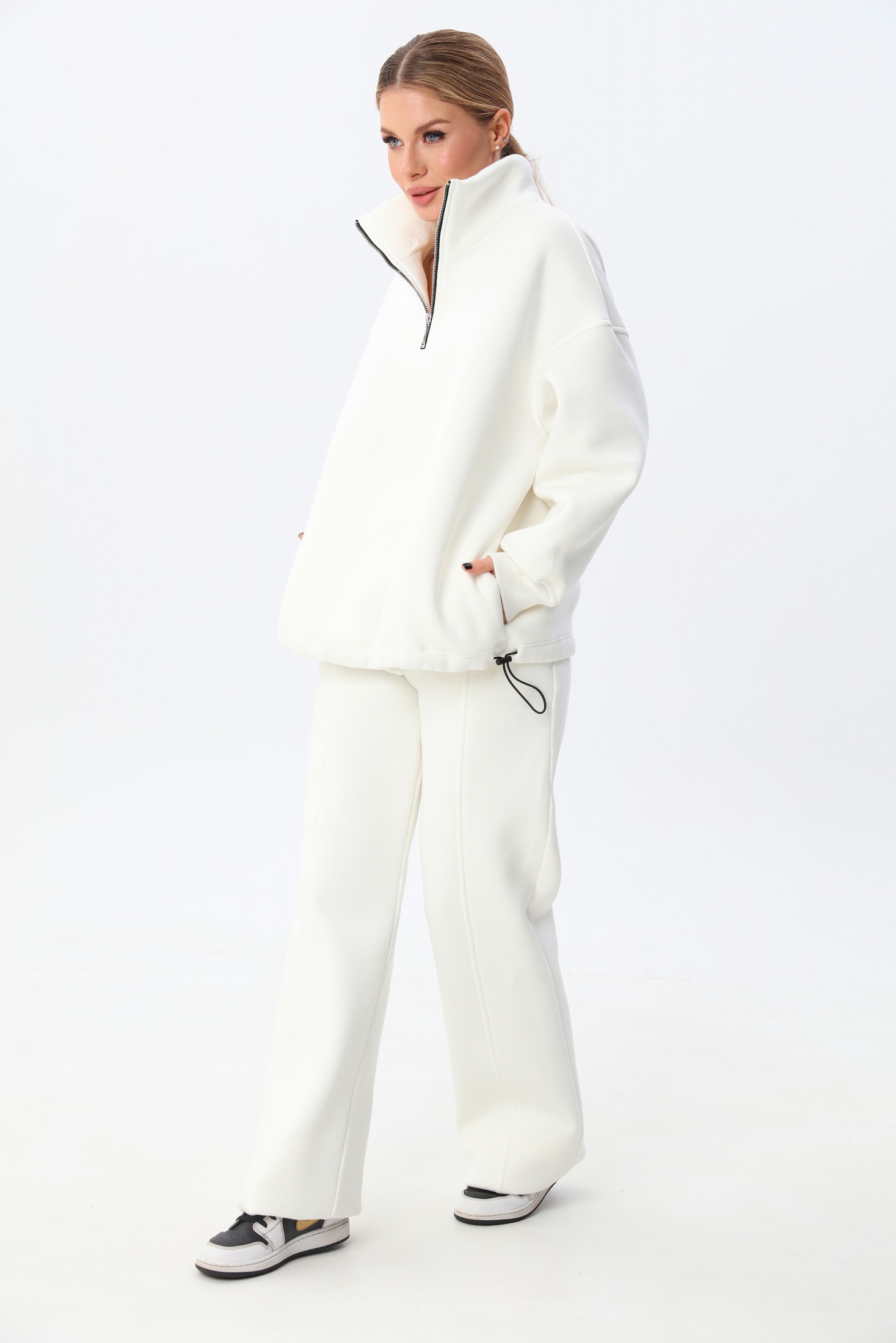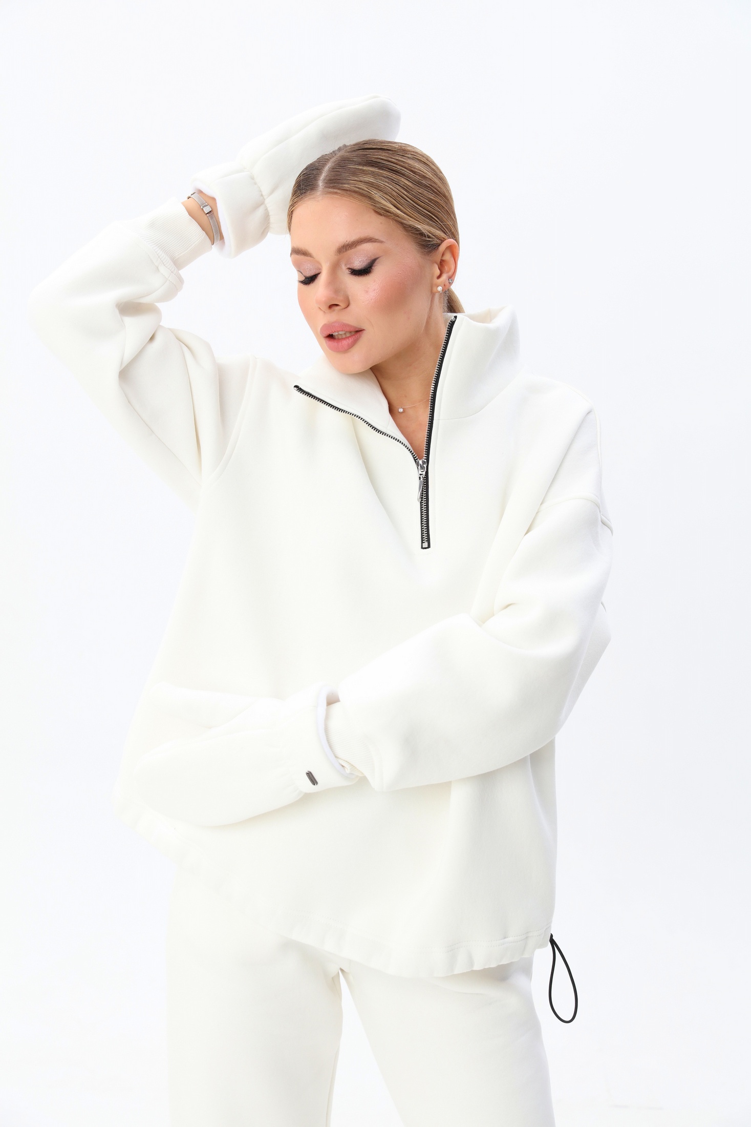 Женский джемпер выполнен из трикотажного полотна с начёсом.