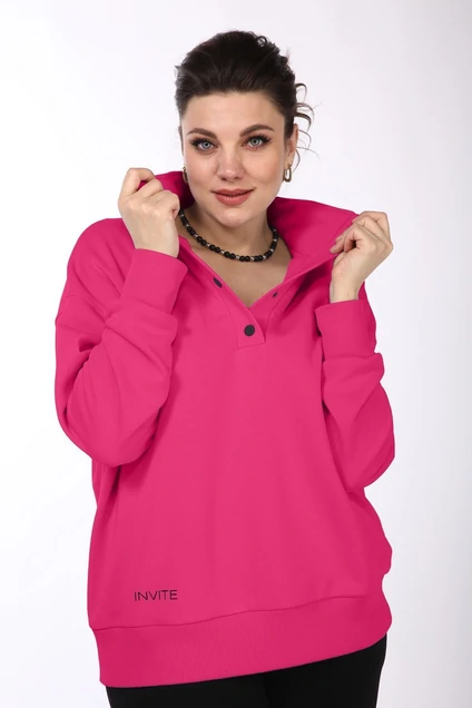 Джемпер женский, изготовленный из трикотажного полотна (футер 3-х нитка петля) прямого свободного силуэта с горловиной стойкой, высотой 9,5см и застежкой на планку на 4 кнопки, со спущенной линией плеча и манжетой по низу изделия. Рукав втачной с манжетой. Спинка изделия без конструктивных элементов. Ширина плеча – 24см, длина рукава – 55см, длина изделия – 68см.