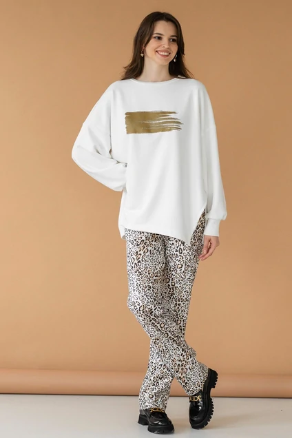 Представляем женский свитшот свободного кроя - идеальный выбор для ценителей комфорта и стиля. Спущенная линия плеча и длинный свободный рукав обеспечивают удобство и свободу движения. Округлая горловина мягко облегает шею, а разрезы по бокам добавляют модели оригинальности. Главная особенность этого свитшота - необычный принт в виде мазка кисти, выполненный в серебристом или золотистом цвете. Этот яркий акцент делает модель неповторимой и привлекает внимание к вашему образу. Свитшот изготовлен из качественных материалов, которые обеспечивают комфорт при носке и сохраняют свой вид даже после многочисленных стирок. Благодаря свободному крою, эта модель прекрасно сочетается с юбкой, платьем, джинсами, леггинсами или брюками, позволяя вам создавать разнообразные образы для повседневной носки, активного отдыха или особых случаев.