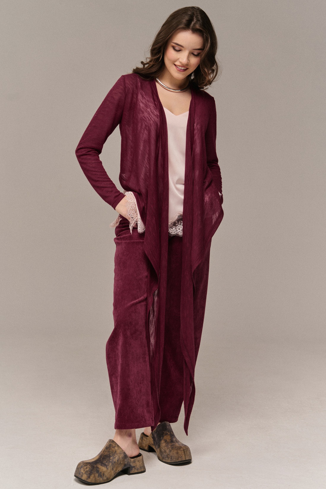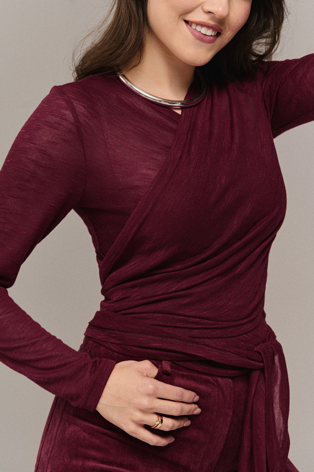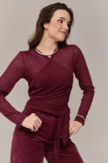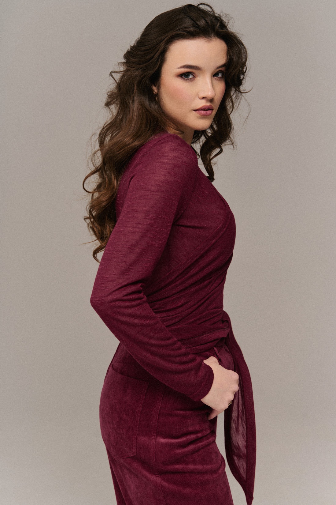 Джемпер женский из трикотажного полотна,без застежки, длиной до талии ,с втачным рукавом.Перед состоит из двух полочек перехорящих в пояс завязку вокруг талии.
