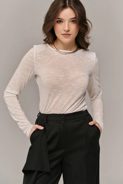 Джемпер женский ( лонгслив )из трикотажного полотна прилегающего силуэта,с втачным удлиненным рукавом.Горловина лодочкообразной формы с окантовкой ее.По плечам плечевые накладки.