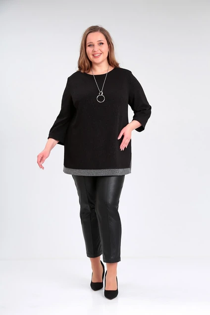 Джемпер женский прямого силуэта выполнен из трикотажного полотна с блеском. Рукав втачной длиной 3/4 заужен к низу за счет вытачек. По переду имеются нагрудные вытачки. По спинке средний шов. Горловина круглой формы, низ изделия обработан фигурной асимметричной планкой из отделочной ткани. Джемпер дополнен кулоном.