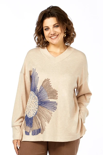 Джемпер свободного кроя, изготовлен из трикотажного полотна. Горловина V-образной формы. На полочке-вышивка. Спинка цельнокроенная. Рукава спущенные, с манжетами по низу. В боковых швах-разрезы.