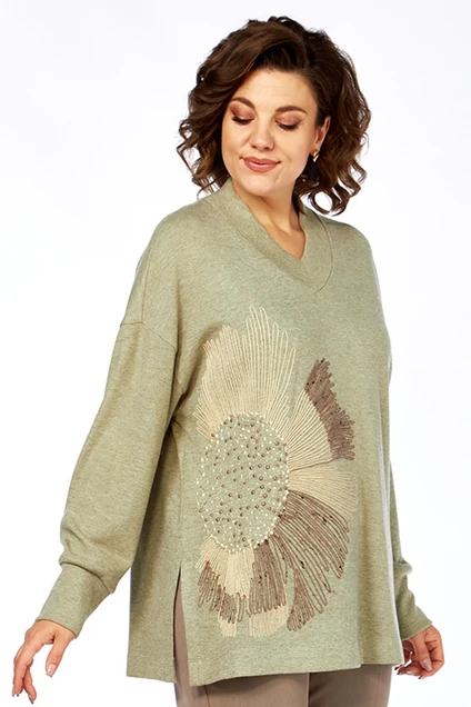 Джемпер свободного кроя, изготовлен из трикотажного полотна. Горловина V-образной формы. На полочке-вышивка. Спинка цельнокроенная. Рукава спущенные, с манжетами по низу. В боковых швах-разрезы.
