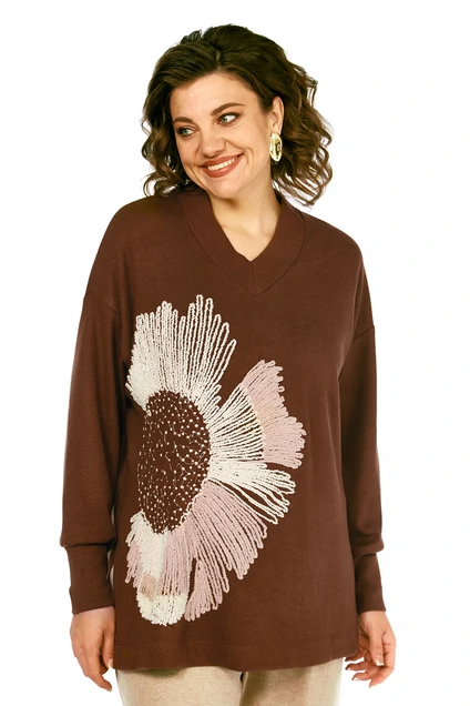 Джемпер свободного кроя, изготовлен из трикотажного полотна. Горловина V-образной формы. На полочке-вышивка. Спинка цельнокроенная. Рукава спущенные, с манжетами по низу. В боковых швах-разрезы.