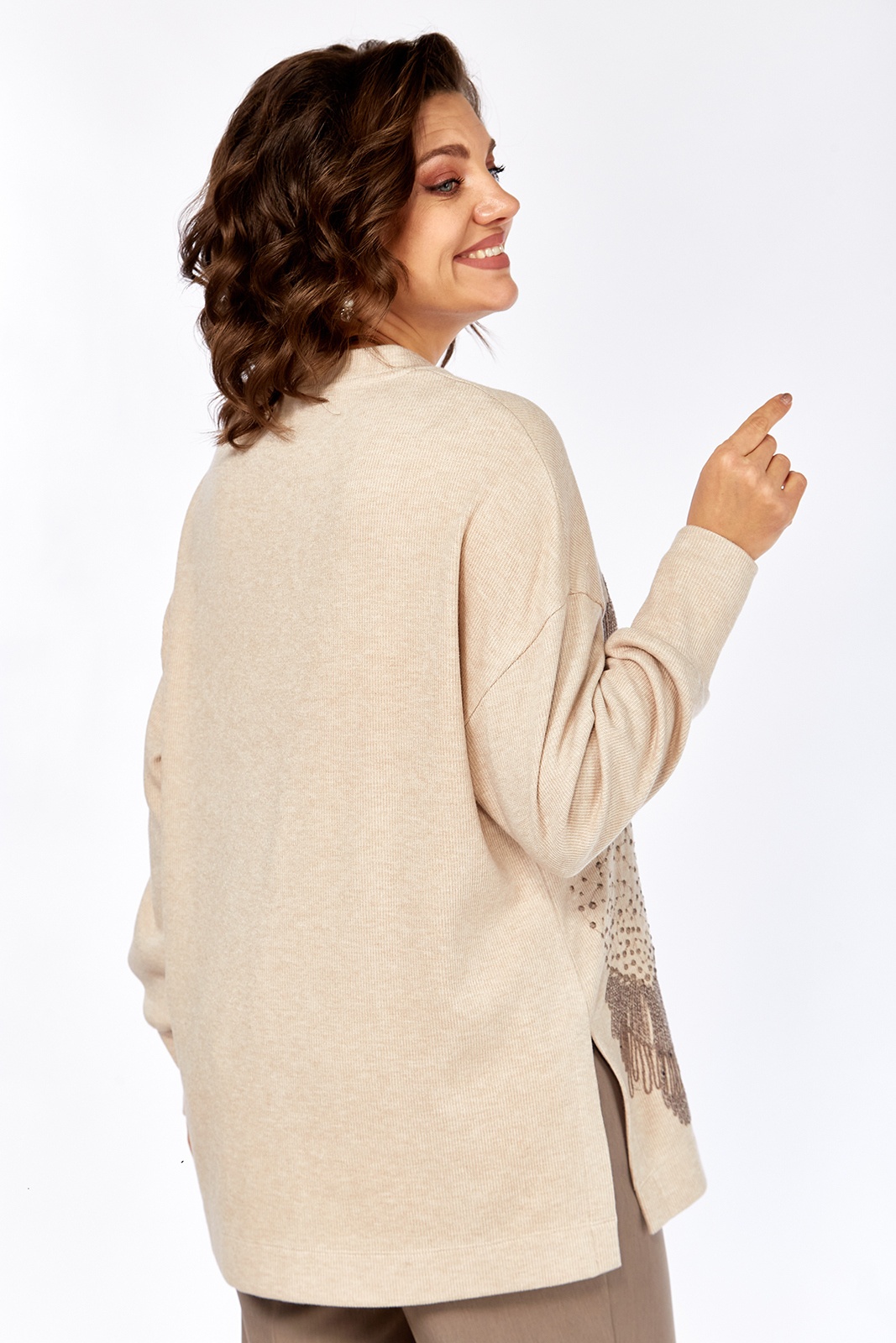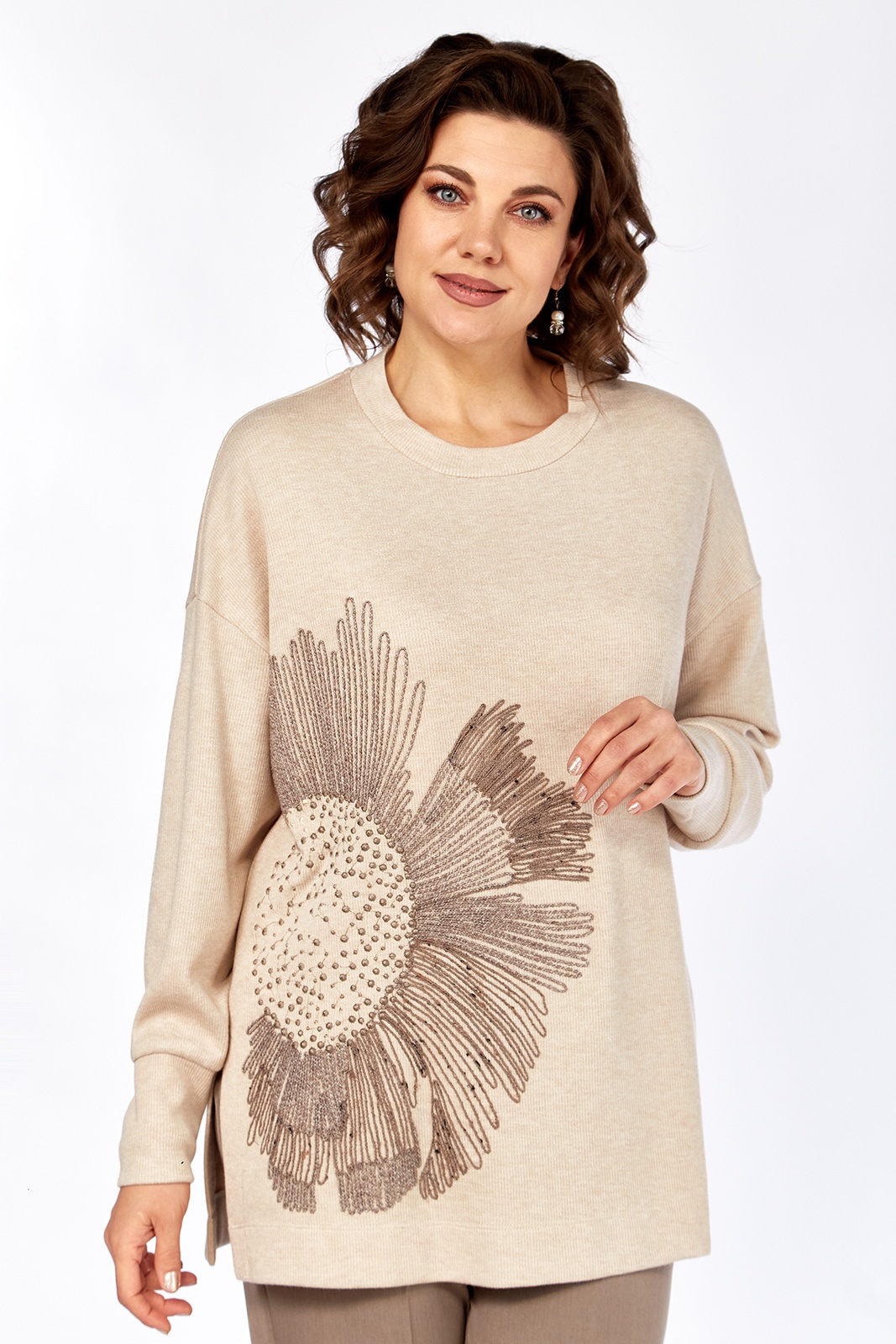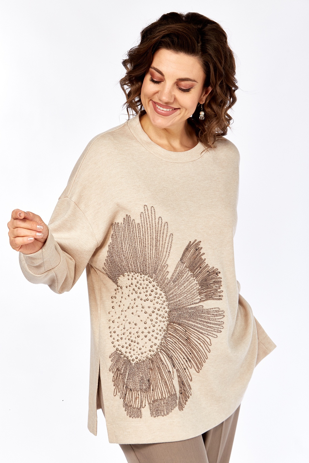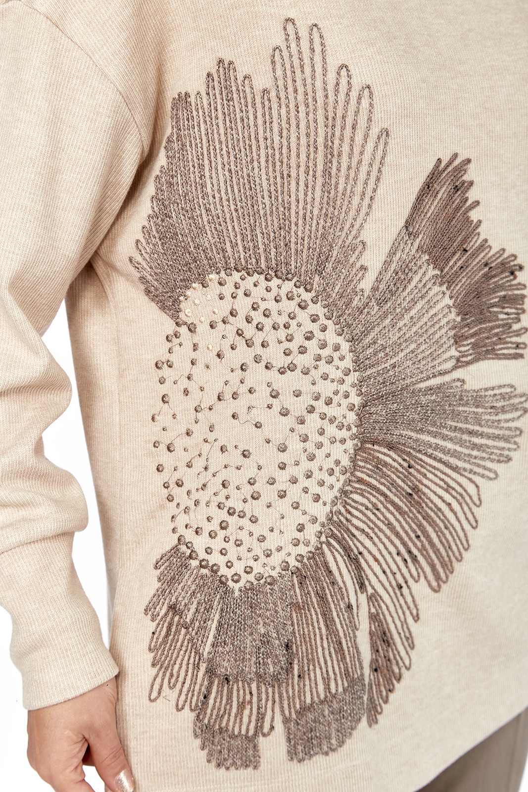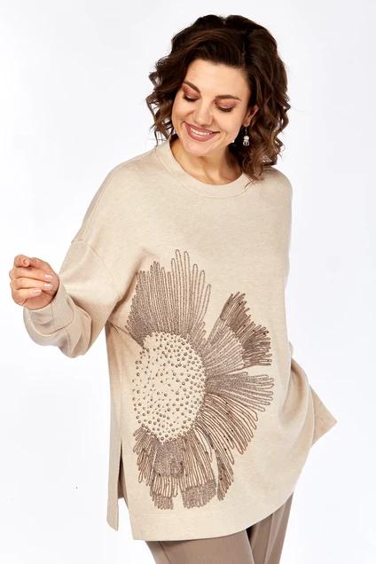 Джемпер женский, свободного кроя, изготовлен из высококачественного трикотажного полотна бежевого цвета, что делает его идеальным выбором для ежедневного использования. Основной акцент в дизайне - это креативная вышивка на передней части в виде ромашки, что придает образу уникальность. Горловина круглой формы дополняет беззаботный стиль джемпера. Рукава спущенные с манжетами по низу, обеспечивают комфорт и свободу движений. Спинка изделия цельнокроенная. Длина джемпера по спинке составляет 69 см, что обеспечивает отличное покрытие. Продукт доступен в размерах с 52 по 58, идеально подойдет для создания как повседневных, так и более составленных образов. Обратите внимание, что цвет изделия на экране может незначительно отличаться от его реального оттенка.