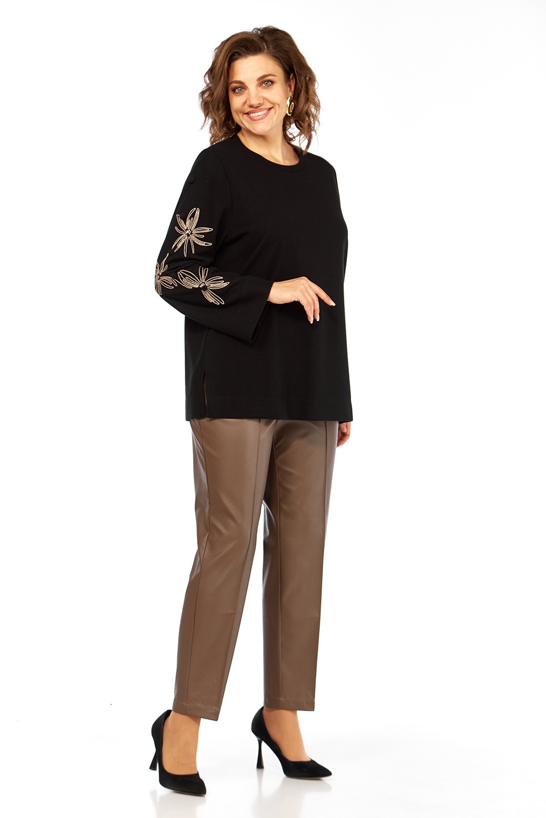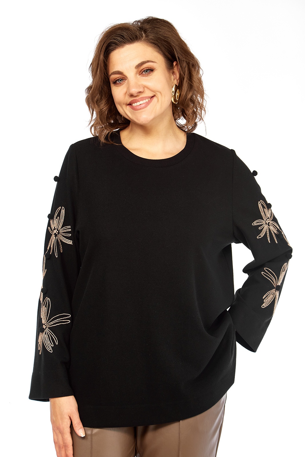 Элегантный женский джемпер черного цвета, созданный для комфорта и стиля. Изготовлен из мягкого трикотажного полотна, дизайн этой модели предусматривает цельнокроеную переднюю часть и спинку. Круглая горловина дополнена классическим вырезом, обеспечивая лаконичную и одновременно изысканную эстетику. Рукава длинные, втачные, привлекают внимание оригинальными декоративными элементами в виде вышивок с цветочными мотивами и изящных помпонов, размещенных на нижней части рукавов. Детали: - Длина джемпера по спинке: 69 см - Длина плеча: 10 см - Длина рукава: 62 см - Доступные размеры: - Размер 52: ПОГ 56 см, ПОБ 60 см - Размер 54: ПОГ 58 см, ПОБ 62 см - Размер 56: ПОГ 60 см, ПОБ 64 см Обратите внимание, что цвет на экране может отличаться от реального цвета изделия. Данный джемпер является прекрасным выбором для создания как повседневных, так и более элегантных образов.