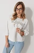 Джемпер женский прямого силуэта «летучая мышь» с округлой горловиной и спущенной линией плеча. По переду в области груди расположена авторская вышивка с пришивным декором. Рукав двухшовный 3/4 соединен с отрезным бочком полочки и спинки. Длина изделия по спинке 54 см, длина рукава 60 см.