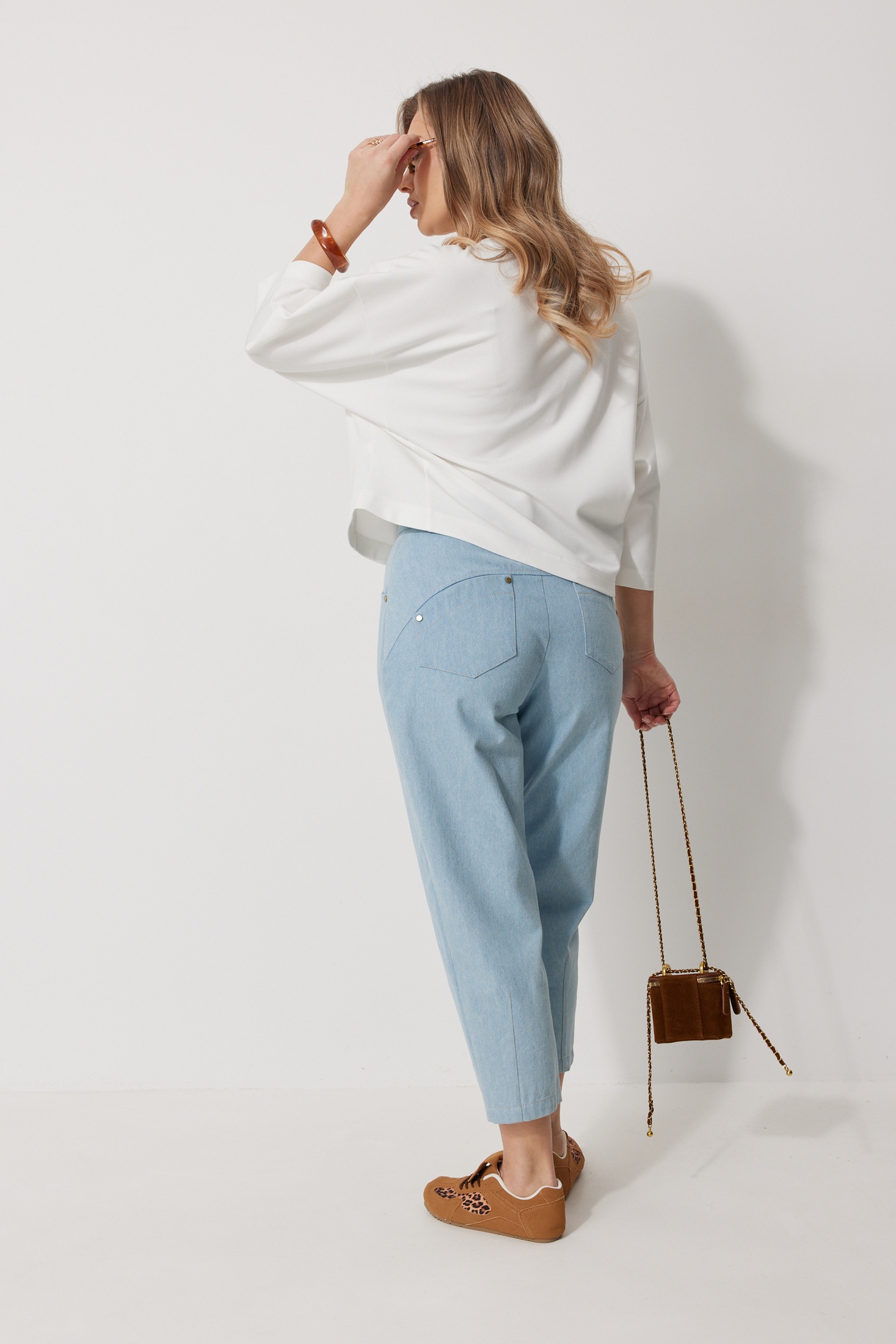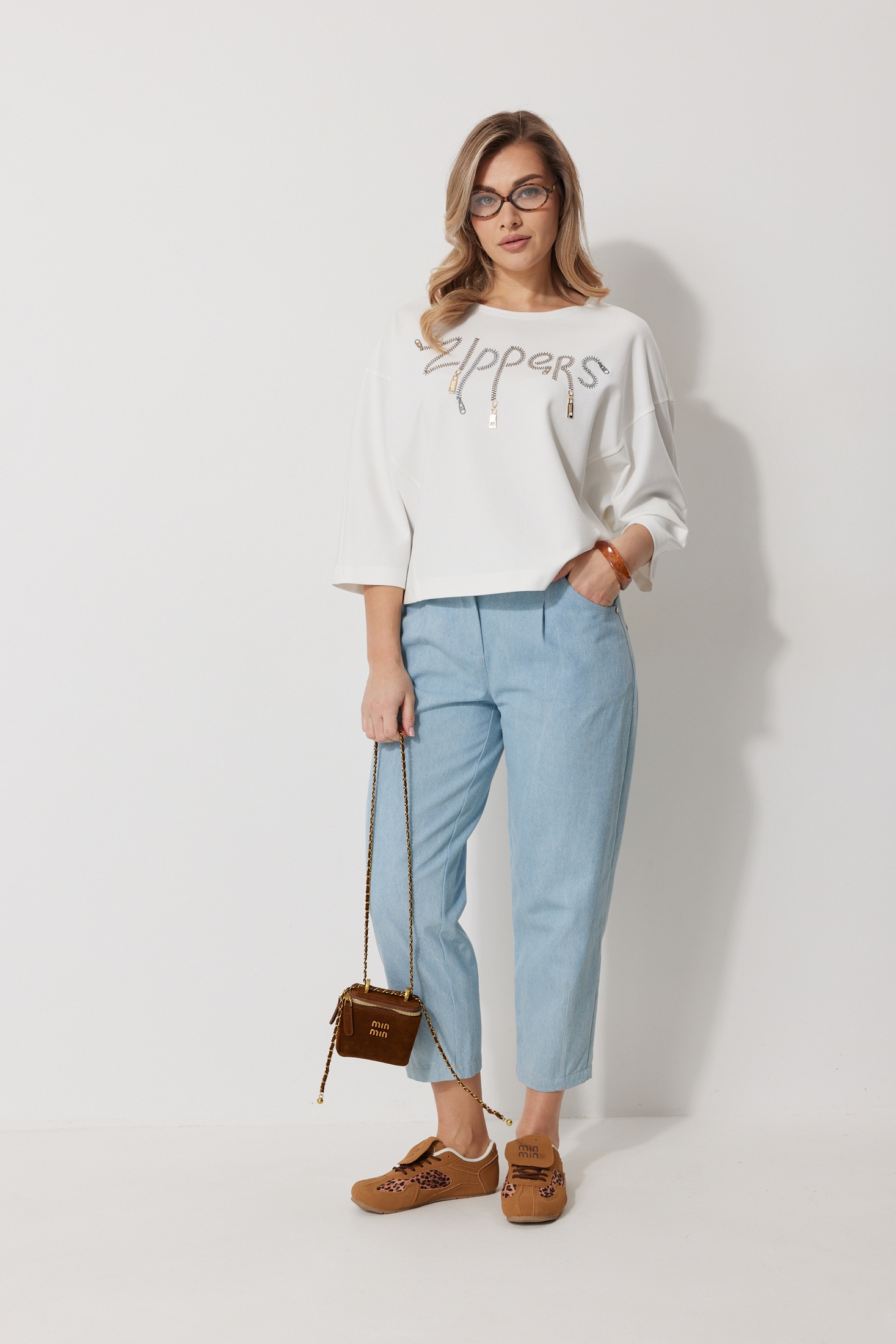 Джемпер женский прямого силуэта «летучая мышь» с округлой горловиной и спущенной линией плеча. По переду в области груди расположена авторская вышивка с пришивным декором. Рукав двухшовный 3/4 соединен с отрезным бочком полочки и спинки. Длина изделия по спинке 54 см, длина рукава 60 см.