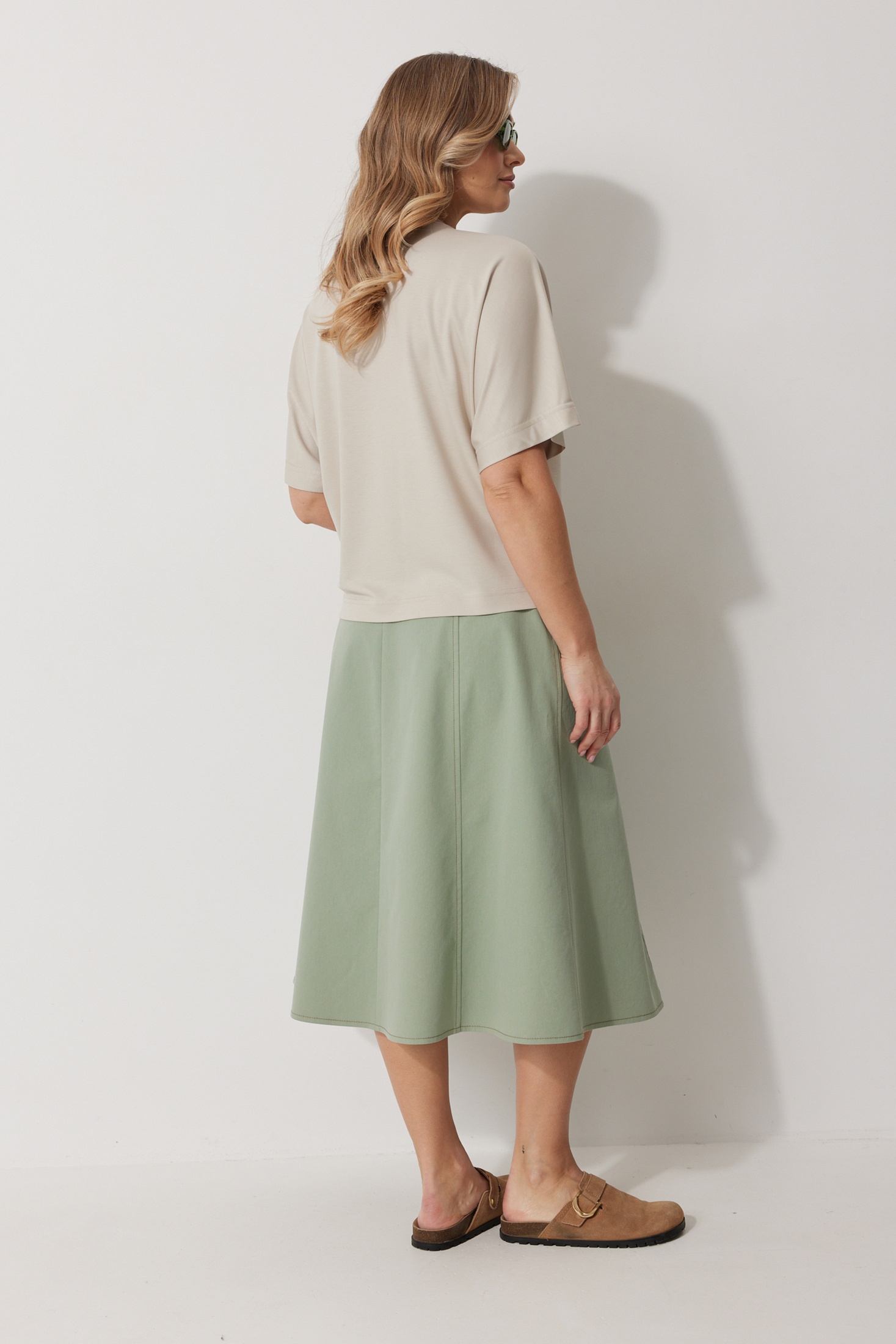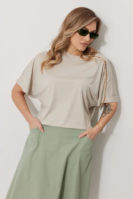 Джемпер женский прямого силуэта с цельнокроеным рукавом. Горловина имеет округлую форму, обработана притачной бейкой. На левом плече располагается притачная кокетка с декором. Длина изделия по спинке 61 см, длина рукава 43 см.