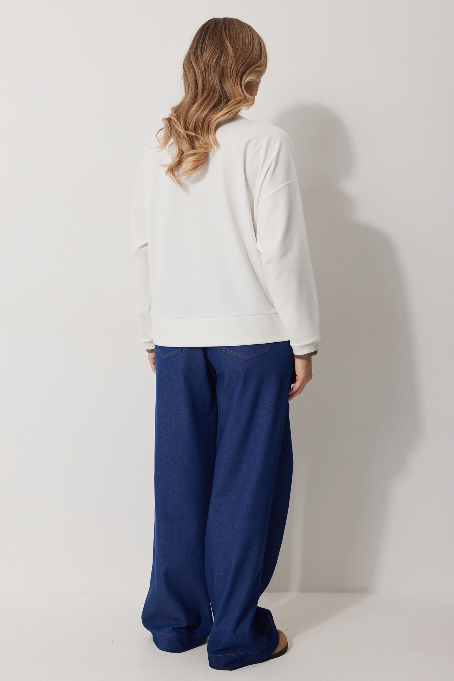 Джемпер женский прямого силуэта со спущенной линией плеча. Горловина округлой формы. Рукав втачной одношовный, полной длины. Горловина и низ рукава обработаны притачным отделочным трикотажным «довязом». Низ блузки джемпера обработан притачной фигурной баской с декором. Длина изделия по спинке 64 см, длина рукава 77 см.