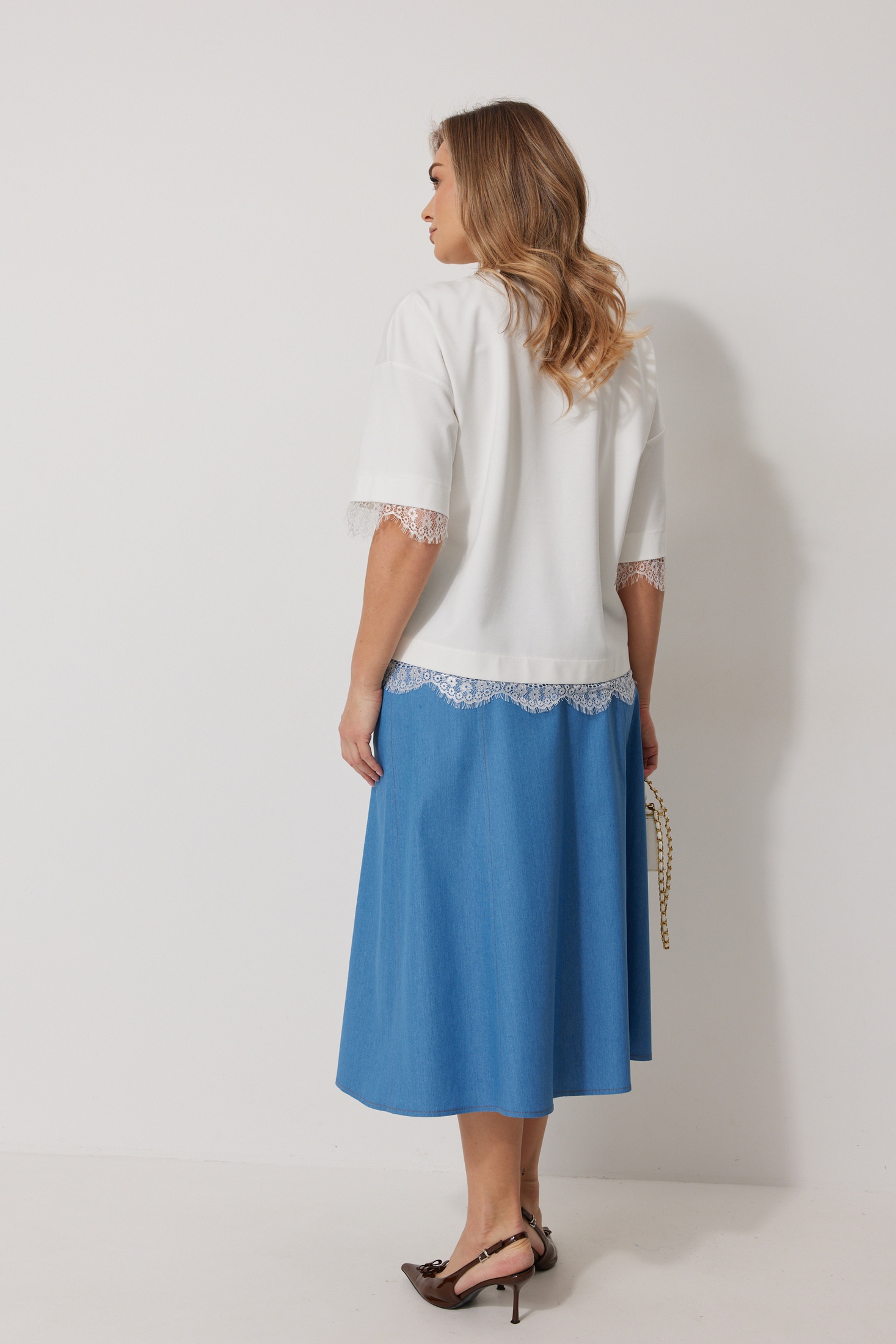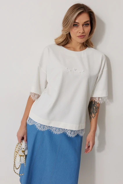 Джемпер женский прямого силуэта со спущенной линией плеча. По переду авторская печать декорированная бусинами. Горловина округлой формы, обработана обтачкой. Рукав втачной одношовный, 3/4 длины. Низ изделия и низ рукава обработаны притачным ажурным кружевом. Длина изделия по спинке 60 см, длина рукава 45 см.