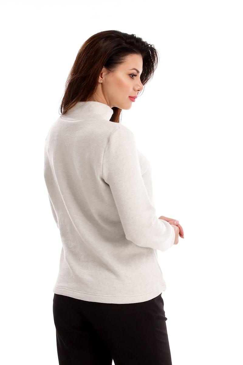 Блуза прямого покроя выполнена из мягкого трикотажного полотна, рукав втачной одношовный, заканчивается манжетой.Воротник стойка, блуза без застежки.Длина спинки по центру 65 см.Изделие не дает усадку, малосминаемое, не вытягивается.