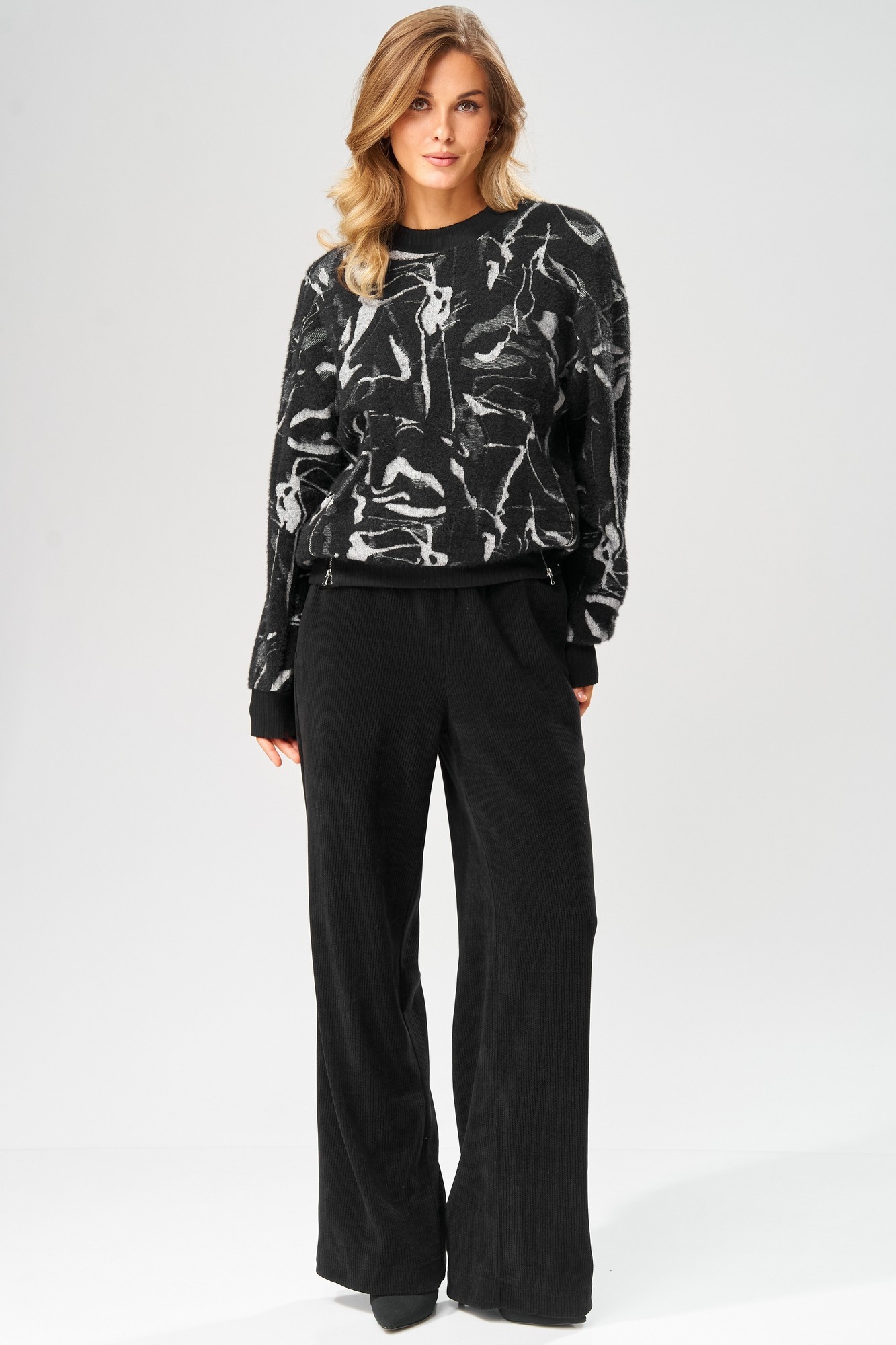 Уютный оригинальный джемпер для повседневного использования. Образ на фото с нашими брюками из модного трикотажного вельвета L-693-2.