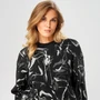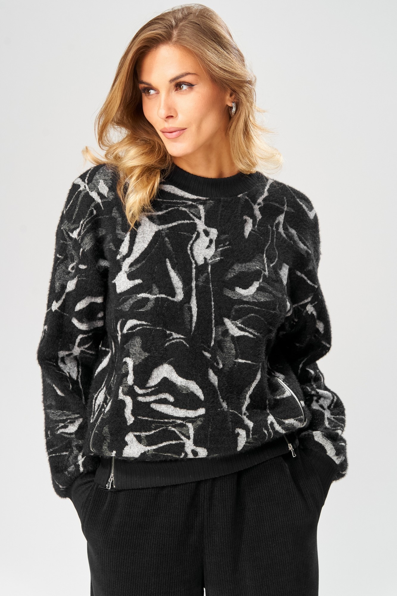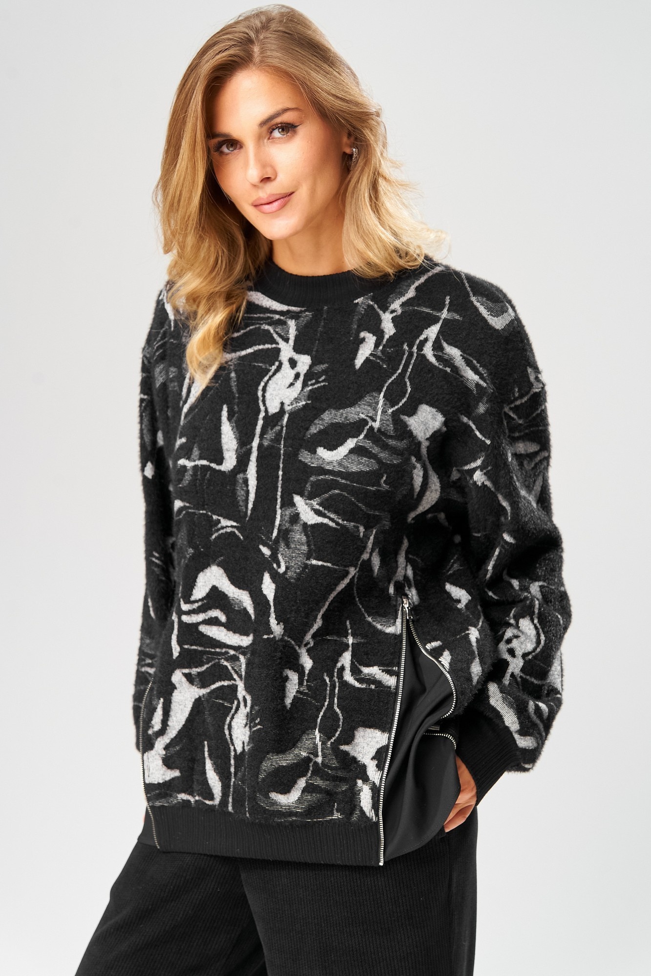Вырез горловины округлой формы, с втачной бейкой. Детали переда с рельефными швами, которые заканчиваются застежкой на функциональную тесьму-молнию и с вставкой из декоративной ткани. Молнии позволяют регулировать ширину и длину изделия. Джемпер со спущенной линией плеча, рукава втачные одношовные с притачными манжетами.
