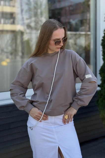 Свитшот женский с разрезами цвета капучино с разрезами – универсальный элемент гардероба для девушек, женщин и даже девочек-подростков!