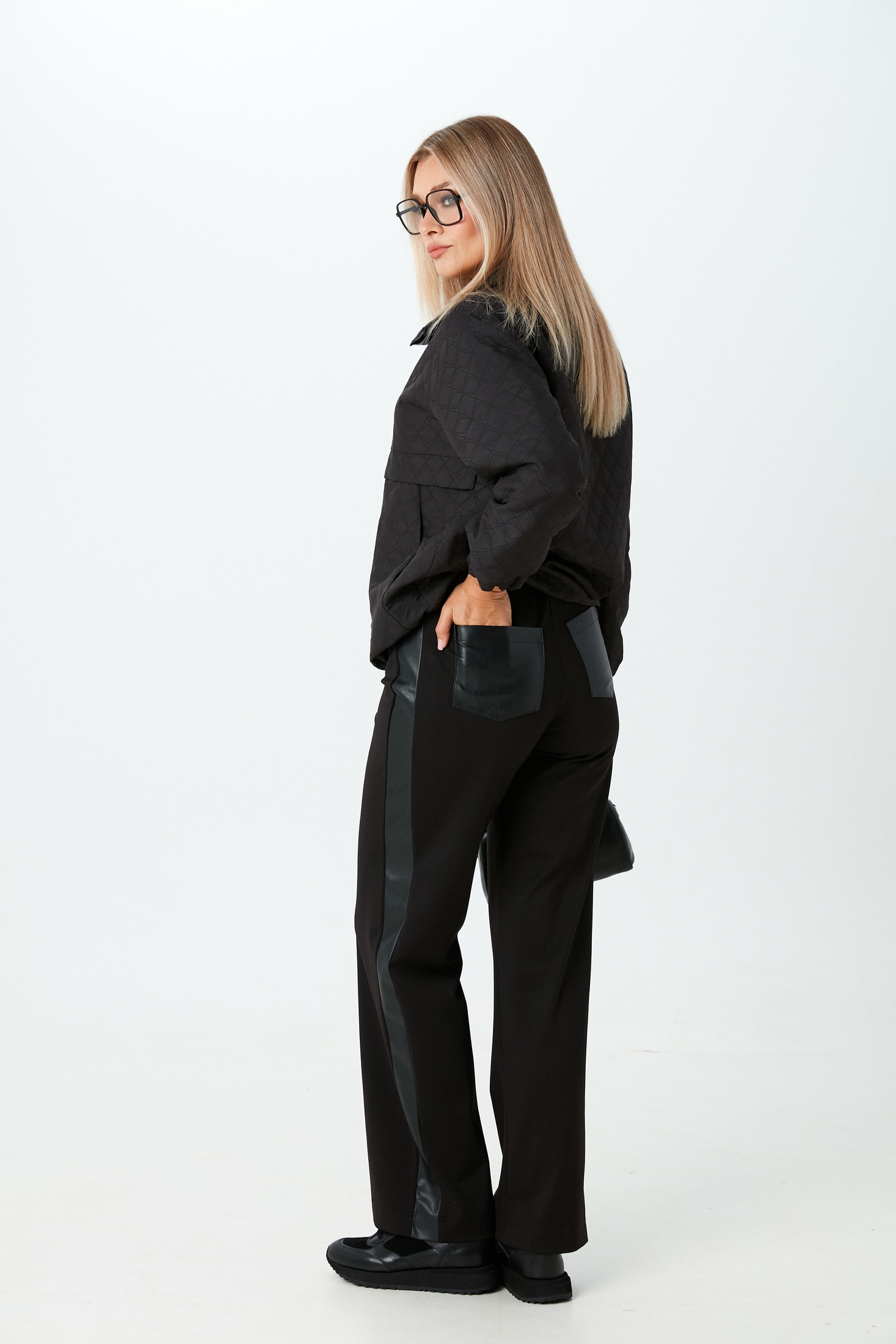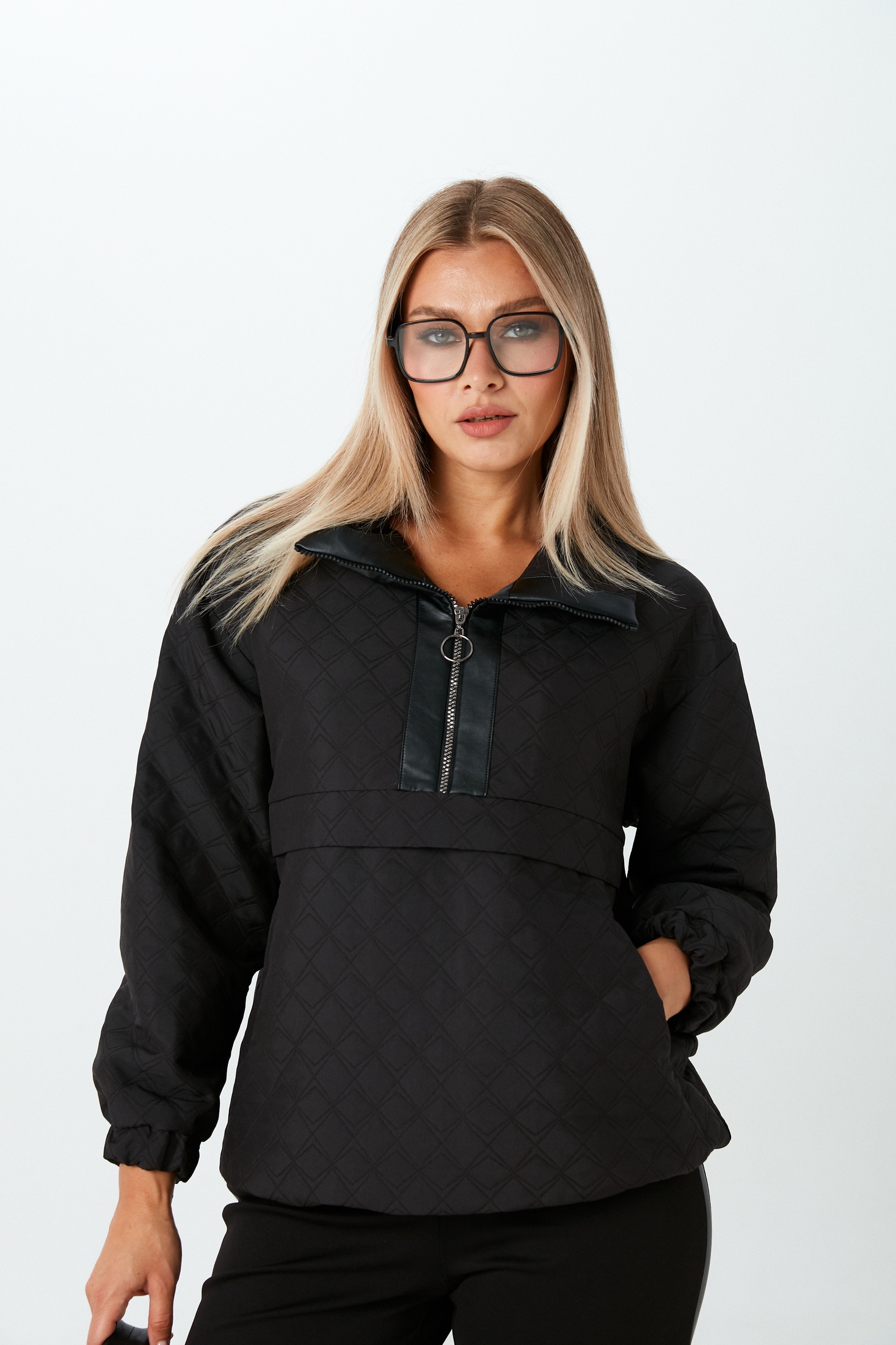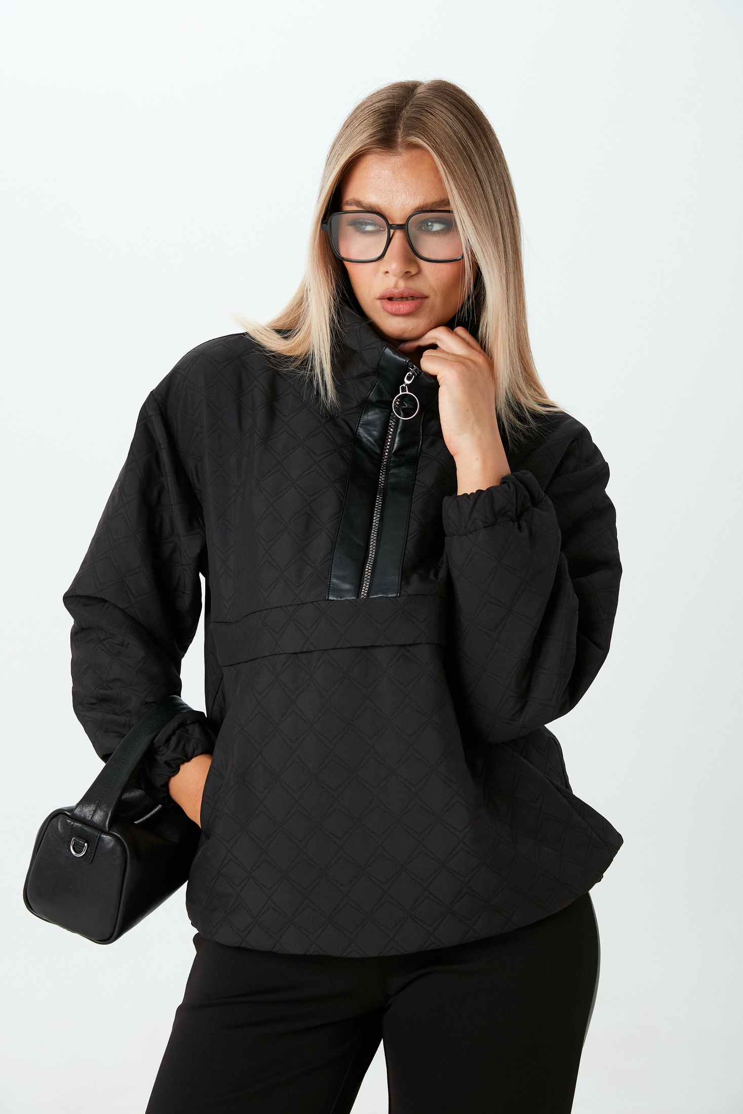 Джемпер свободного кроя из стёганой ткани черного цвета. Модель оснащена горловиной на молнии с элегантной окантовкой из экокожи, добавляющей изысканный акцент. Манжеты и низ джемпера выполнены на резинке, обеспечивая комфортное прилегание. По бокам предусмотрены удобные карманы для мелких предметов. Этот джемпер идеально подойдет для создания образа в стиле casual.