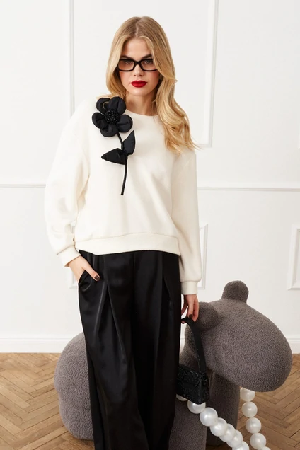 Джемпер свободного кроя выполнен из трикотажного полотна. Рукав длинный, линия плеча спущена, по низу рукава манжета. Округлый вырез горловины обработан бейкой. В комплектацию входит съёмный цветок ручной работы, выполненный из тафты и синтепона, а центральная часть цветка вышита бисером и стразами.