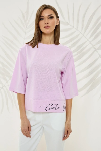 Укороченный джемпер свободного силуэта из трикотажного полотна. Рукав широкий втачнойодношовный со спущенной линией плеча длиной ¾. Горловина округлая с притачной бейкой. По низу изделия притачной широкий пояс с дизайнерской вышивкой. Длина изделия: 54 см
