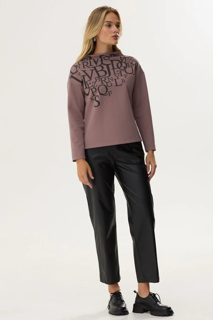 Стильный джемпер прямого силуэта из трикотажного полотна с удлиненной спинкой. Горловина- стойка цельнокроенная. Рукав со спущенной линией плеча длиной 7/8. В боковых швах декоративные разрезы. По переду дизайнерская печать. Длина изделия: (44-48-67 см), (50-54-70 см),(56-60-74 см), отклонение +/-2 см.