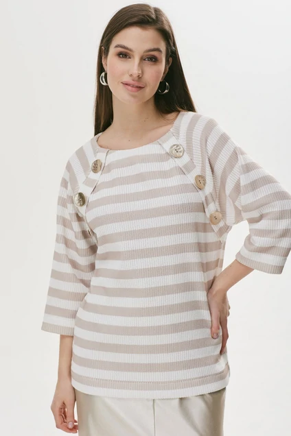 Джемпер прямого силуэта из трикотажного полотна. Горловина округлая. Рукав реглан длиной 3/4. По переду декоративная складка с пуговицами. Обращаем ваше внимание, что фурнитура может незначительно отличаться от фото. Длина джемпера: (44-48р – 63 см)(50-54р - 66 см)(56-60р - 69 см)