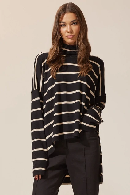 Джемпер свободного силуэта из трикотажного полотна с фигурным низом. Горловина-стойка. Рукав со спущенной линией плеча длинный. В боковых швах по низу разрезы. Спинка изделия длинее переда. Длина спинки (44-60р - 76см), длина переда (44-48р - 49см)(50-54р - 51,5см)(56-60р - 53см)